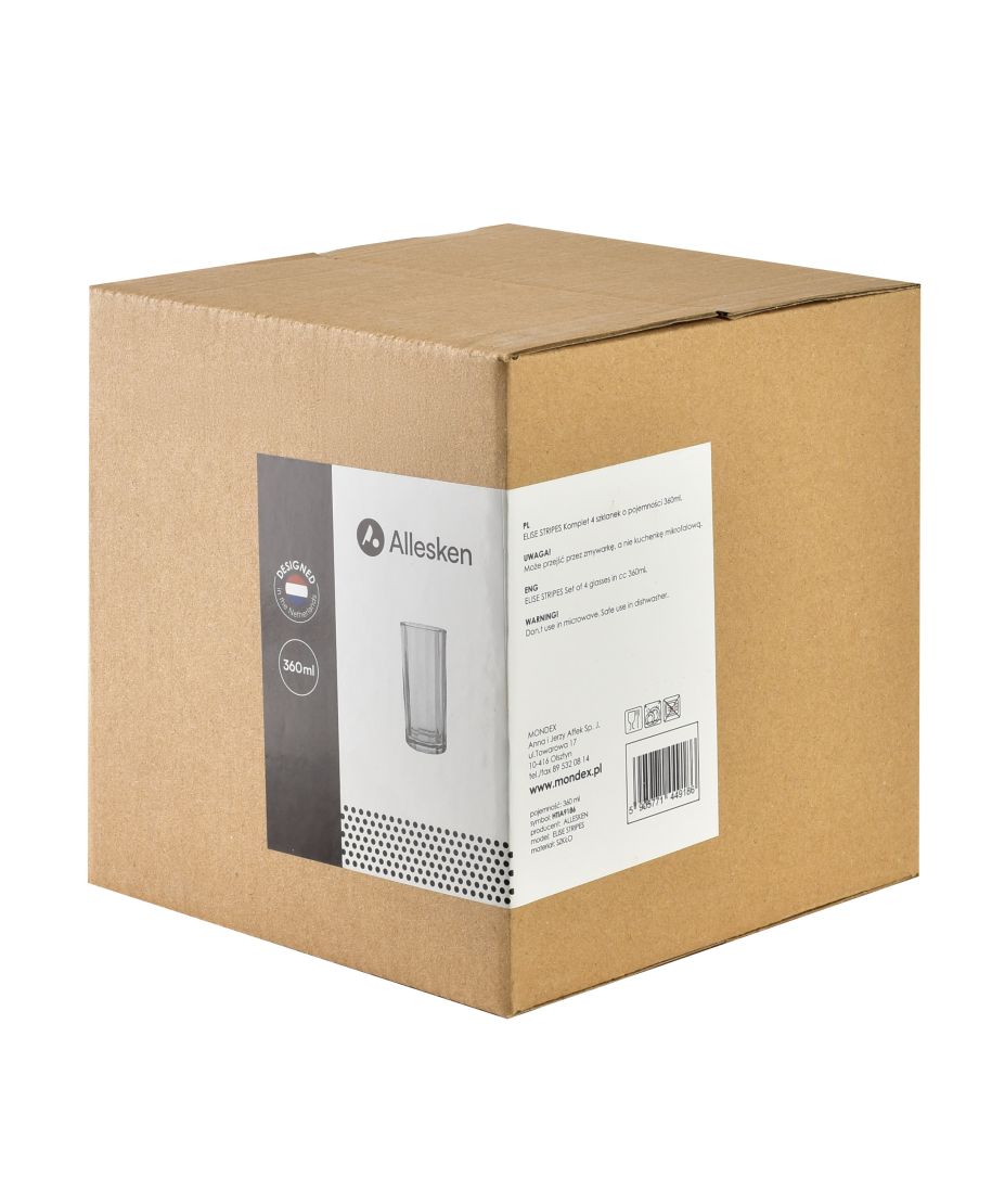 Komplet 4 szklanek ELISE STRIPES o pojemności 360 ml to stylowe i nowoczesne naczynia wykonane ze szkła sodowego. Mają wymiary 7 7 15 cm i transparentną formę ozdobioną delikatnym wzorem w pasy, który nadaje im elegancki, a zarazem lekki charakter. Szklanki nadają się do mycia w zmywarce, co czyni je praktycznym wyborem na co dzień. Zapakowane są jednostkowo w ekologiczne opakowanie typu eco box. Ich uniwersalny design pozwala na swobodne łączenie z innymi kolorami szklanek i kieliszków z tej samej serii, umożliwiając tworzenie spójnych, a jednocześnie zróżnicowanych zestawów.