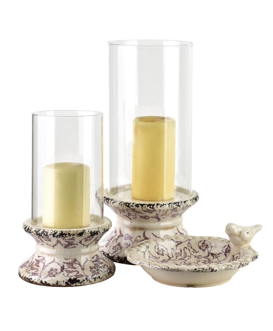 Oto opis większego świecznika z linii EVAM, przygotowany w formie płynnego tekstu bez podpunktów:EVAM. Wysoki Szklany Świecznik na Dekoracyjnej Podstawie (35 cm) Okazały świecznik z kolekcji EVAM o wysokości 35 cm to dekoracja o wyjątkowych walorach estetycznych, która stanie się luksusowym akcentem w każdym salonie lub jadalni. Produkt charakteryzuje się smukłą i wysoką sylwetką, uzyskaną dzięki połączeniu wydłużonego, szklanego klosza z elegancką, ceramiczną stopą. Podstawa naczynia, o profilowanym kształcie, została ozdobiona kunsztownym roślinnym wzorem w odcieniu głębokiego fioletu, który pięknie odcina się na jasnym tle ceramiki. Przezroczysty, cylindryczny klosz zapewnia bezpieczne spalanie świecy i idealne rozproszenie blasku, tworząc we wnętrzu niepowtarzalną, nastrojową atmosferę. Dzięki imponującym wymiarom 17,5 x 17,5 x 35 cm świecznik ten doskonale prezentuje się jako samodzielna ozdoba na kominku, konsoli lub jako element rozbudowanej, wielopoziomowej kompozycji świetlnej. Wyjątkowy design serii EVAM sprawia, że jest to idealny wybór do wnętrz urządzonych w stylu klasycznym, romantycznym oraz glamour.Specyfikacja produktu: Świecznik posiada wymiary 17,5 x 17,5 x 35 cm. Został wykonany z wysokiej jakości szkła oraz ceramiki zdobionej fioletowym motywem kwiatowym. Produkt należy do eleganckiej kolekcji akcesoriów domowych EVAM.