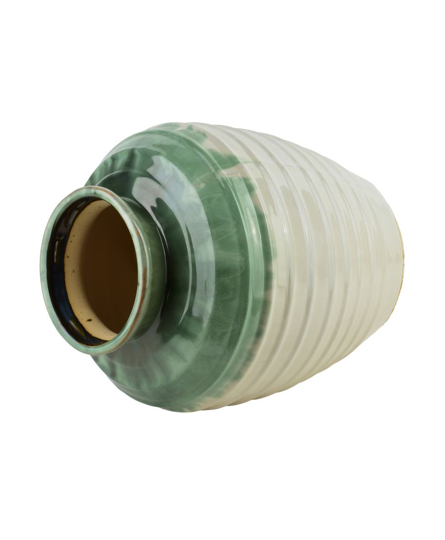 Elegancki ceramiczny wazon EVRO to wyrafinowany element dekoracyjny, który wnosi do wnętrza spokój i naturalną harmonię. Model wyróżnia się szkliwieniem w subtelnych odcieniach zieleni i kremu, tworząc miękkie, płynne przejścia kolorystyczne inspirowane naturą.Delikatnie połyskująca powierzchnia podkreśla organiczny charakter wazonu i nadaje mu lekko artystycznego wyrazu, dzięki czemu świetnie odnajduje się zarówno w aranżacjach nowoczesnych, jak i klasycznych czy boho. Obła, stabilna forma sprawia, że wazon prezentuje się doskonale jako samodzielna dekoracja, ale równie pięknie eksponuje świeże kwiaty, gałązki lub dekoracje sezonowe.Dzięki proporcjonalnym wymiarom 32,532,539,5cm wazon idealnie sprawdzi się na podłodze, komodzie, konsoli lub dużym stole, stając się subtelnym, a zarazem wyrazistym akcentem aranżacji.EVRO to połączenie ceramicznej solidności z delikatnością kolorów, które wprowadza do wnętrza naturalną elegancję i ponadczasowy styl. Jednostkowo zapakowane w brązowy karton.