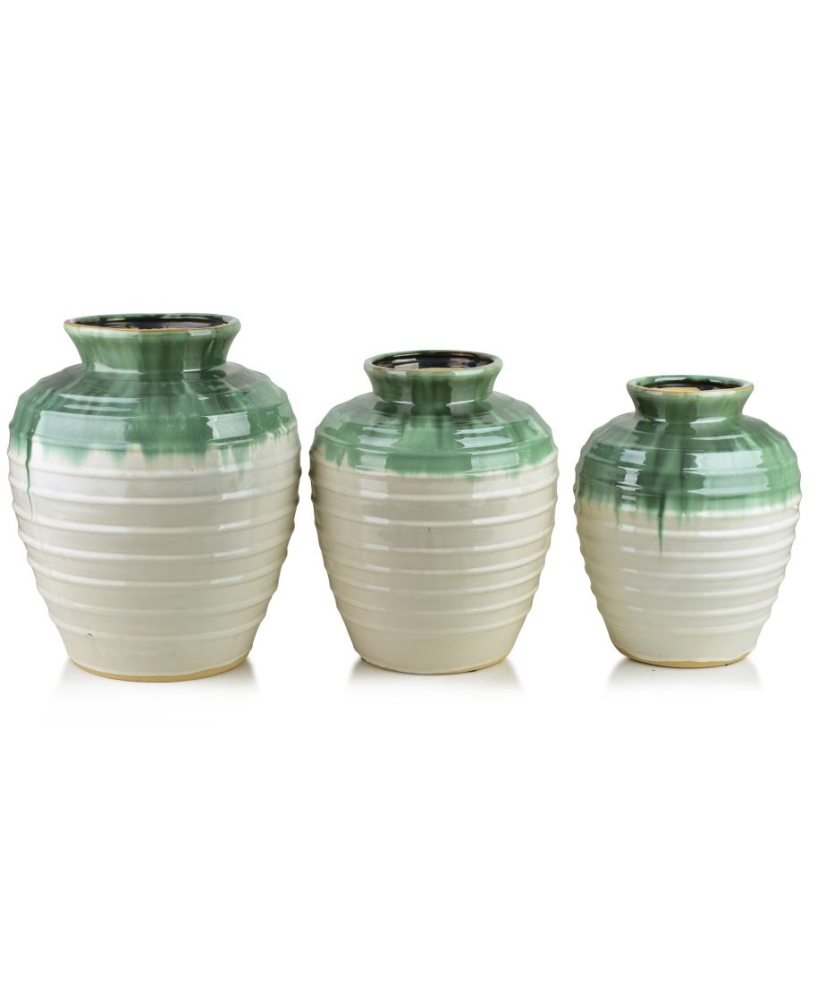 Elegancki ceramiczny wazon EVRO to wyrafinowany element dekoracyjny, który wnosi do wnętrza spokój i naturalną harmonię. Model wyróżnia się szkliwieniem w subtelnych odcieniach zieleni i kremu, tworząc miękkie, płynne przejścia kolorystyczne inspirowane naturą.Delikatnie połyskująca powierzchnia podkreśla organiczny charakter wazonu i nadaje mu lekko artystycznego wyrazu, dzięki czemu świetnie odnajduje się zarówno w aranżacjach nowoczesnych, jak i klasycznych czy boho. Obła, stabilna forma sprawia, że wazon prezentuje się doskonale jako samodzielna dekoracja, ale równie pięknie eksponuje świeże kwiaty, gałązki lub dekoracje sezonowe.Dzięki proporcjonalnym wymiarom 36,536,544 cm wazon idealnie sprawdzi się na podłodze, komodzie, konsoli lub dużym stole, stając się subtelnym, a zarazem wyrazistym akcentem aranżacji.EVRO to połączenie ceramicznej solidności z delikatnością kolorów, które wprowadza do wnętrza naturalną elegancję i ponadczasowy styl. Jednostkowo zapakowane w brązowy karton.