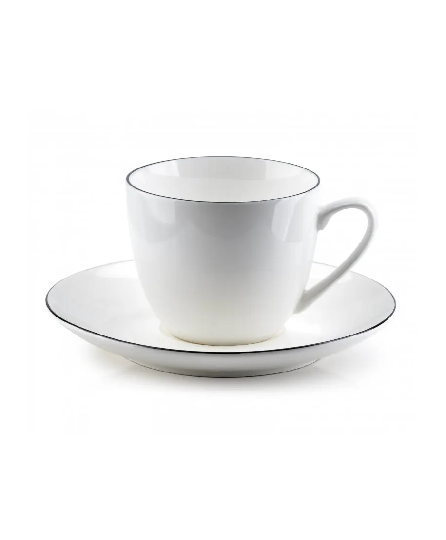 Filiżanka ze spodkiem Simple by Mondex. Seria ta wykonana jest z porcelany w kolorze białym z ozdobnym czarnym rantem. Jest idealna do serwowania kawy. Naczynia z tej serii można myć w zmywarce i używać w kuchence mikrofalowej.