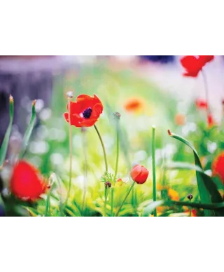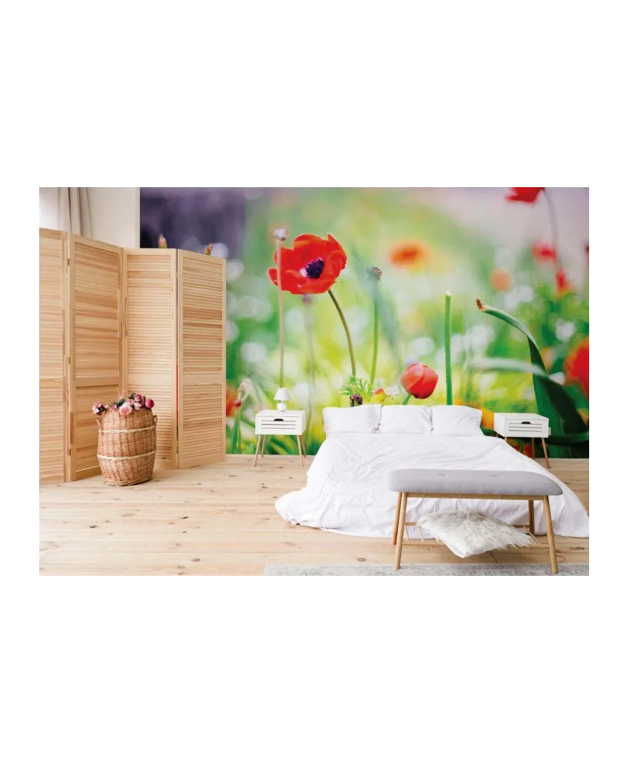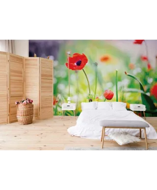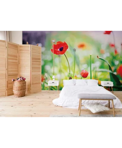 Maki na łące - fototapeta o wymiarach 320x230 cm. Chciałbyś odmienić wnętrze swojego mieszkania w szybki i prosty sposób? Możesz uzyskać wspaniały efekt bez zbędnych remontów i wielkich wydatków wybierając fototapetę.