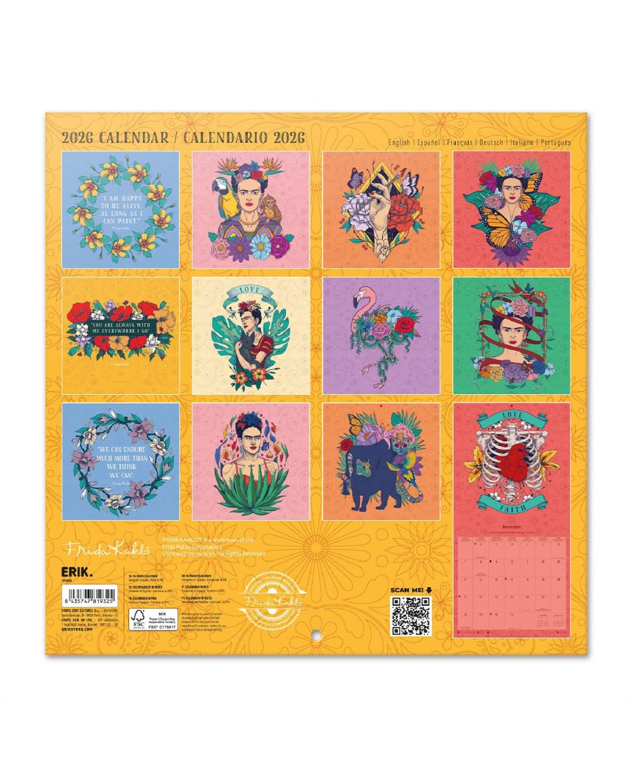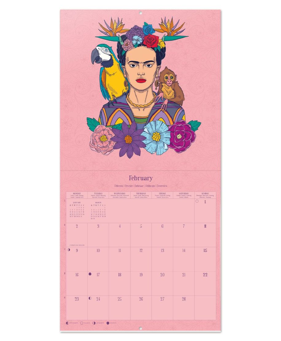Frida Kahlo oficjalny kalendarz na ścianę na 2026rok Oryginalny i licencjonowany kalendarz, posiada 12 rozkładanych stron o wymiarach 30x60 cm. Na każdej z kart znajduje się duża fotografiaoraz czytelne kalendarium z miejscem na notatki. W kalendarzu znajduje się 12 unikalnych zdjęć dla każdego miesiąca + plakat. Okładki wykonane są z papieru powlekanego matowego i laminowanego o gramaturze 250 g/m2, wnętrze z papieru powlekanego matowego o gramaturze 150 g/m2. Nagłówki są w 6 językach:angielski, hiszpański, francuski, włoski, niemiecki i portugalski. Oprawa zszywkowa. Złożony kalendarz 30x30 cm. Rozłożony kalendarz 30x60 cm. Zawiera otwór 5 mm do zawieszenia na ścianie.