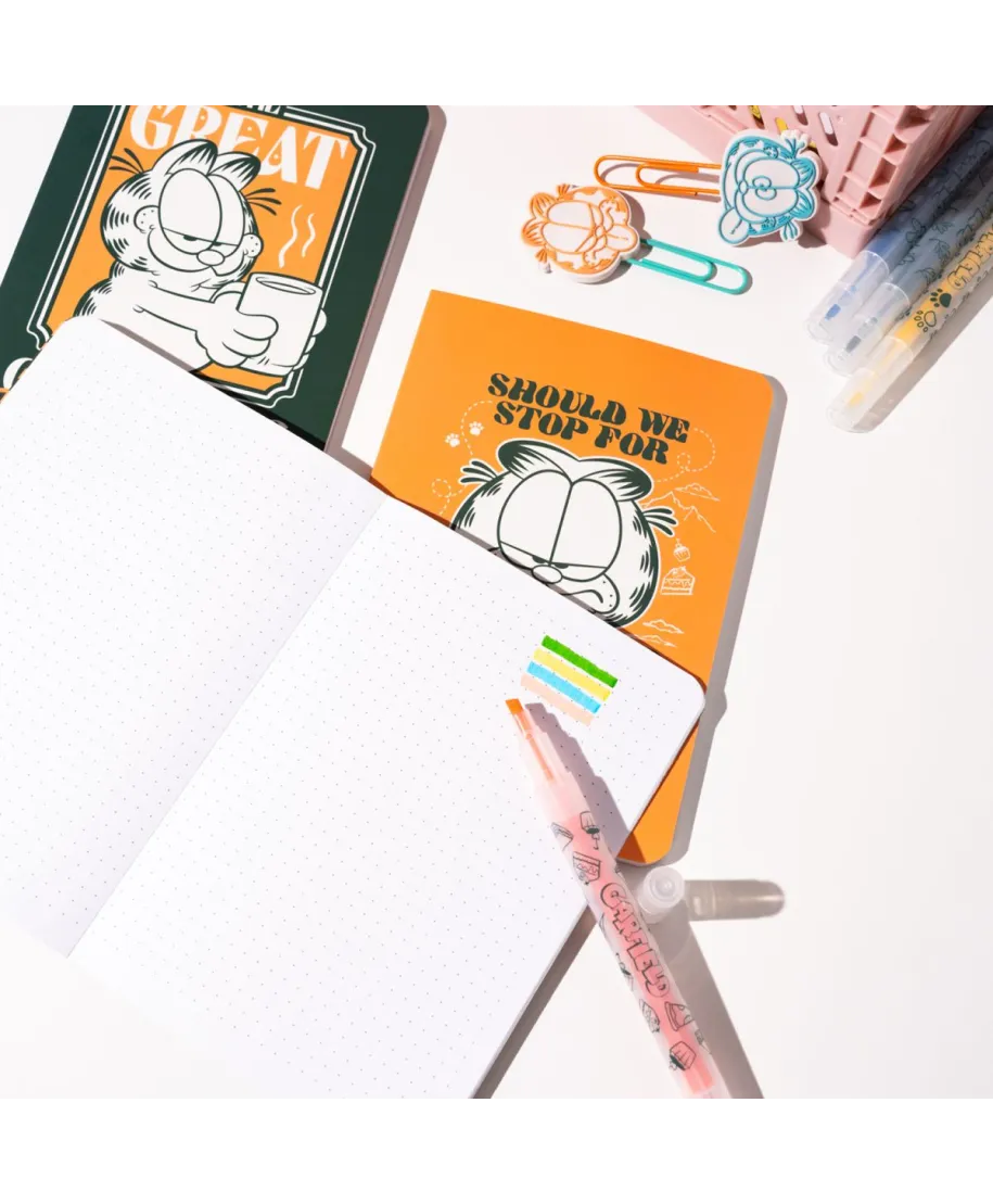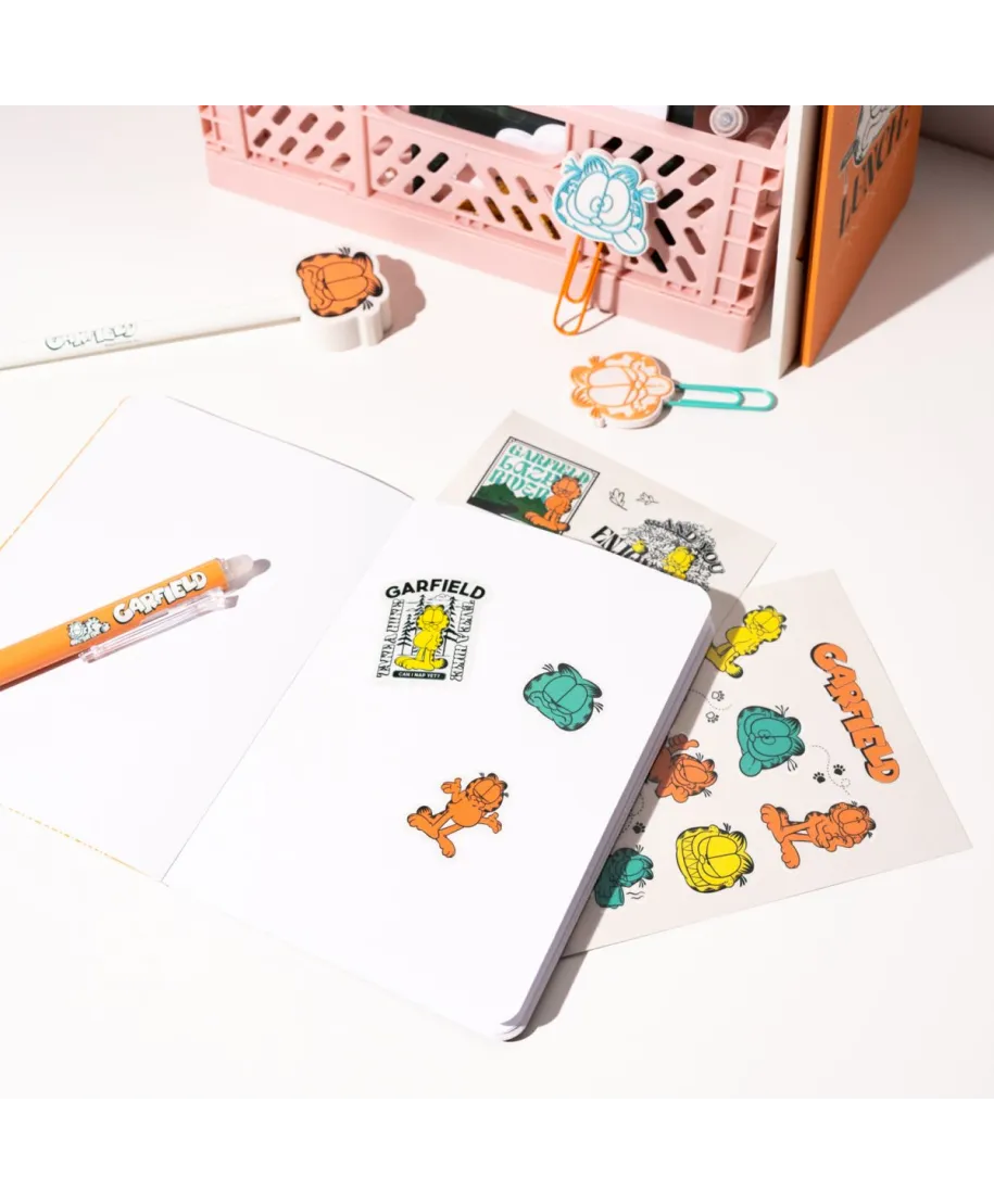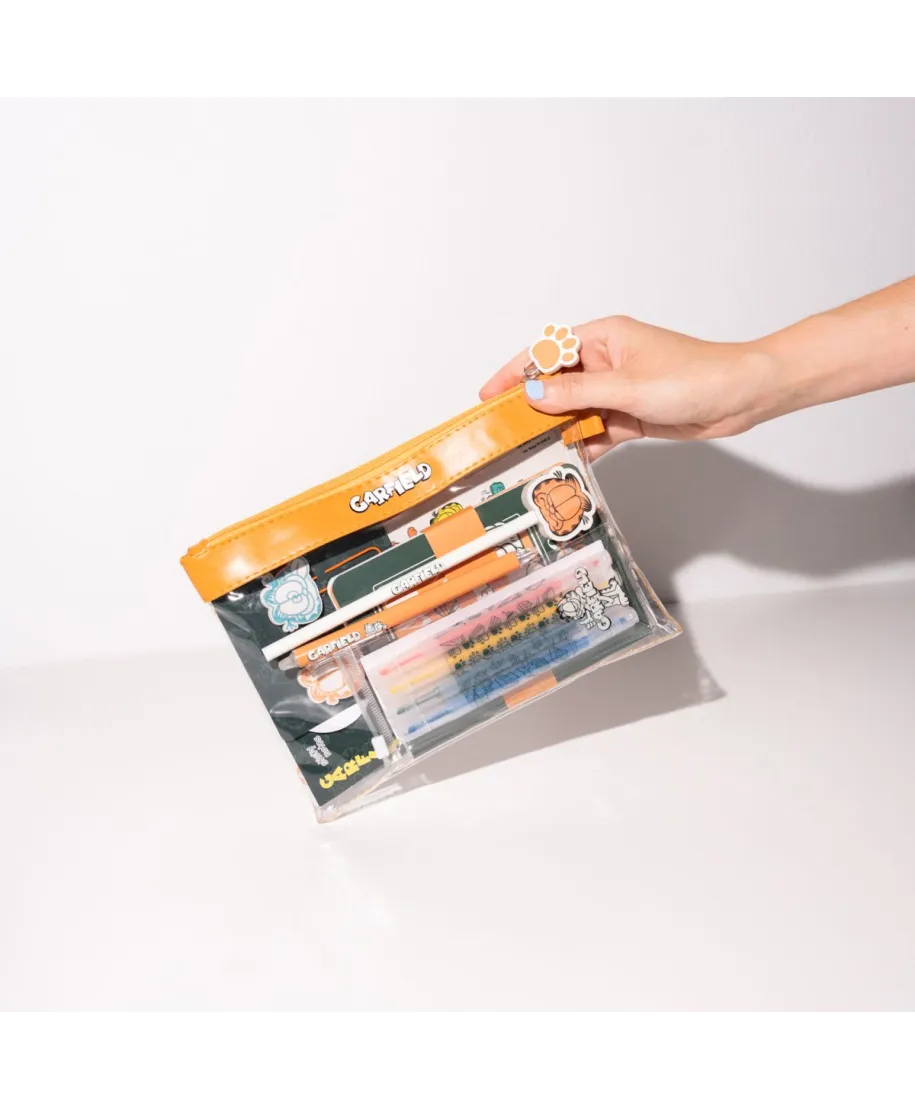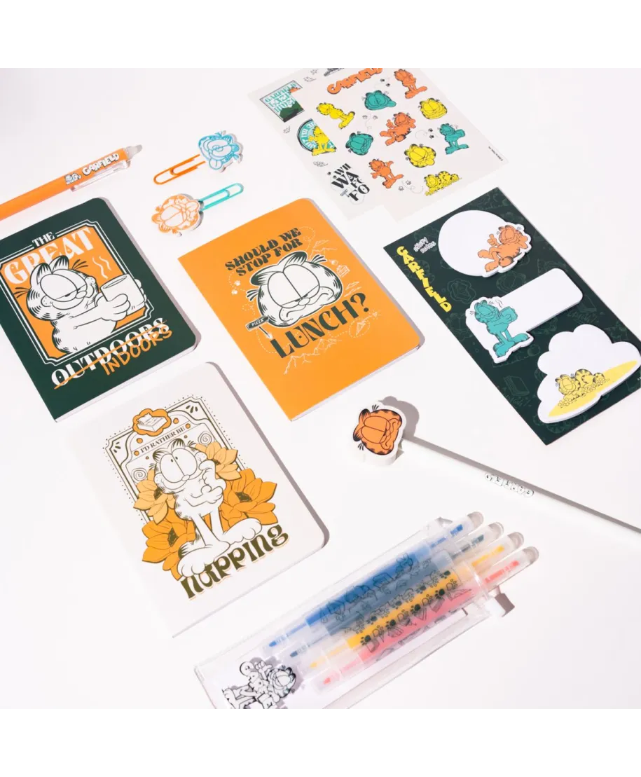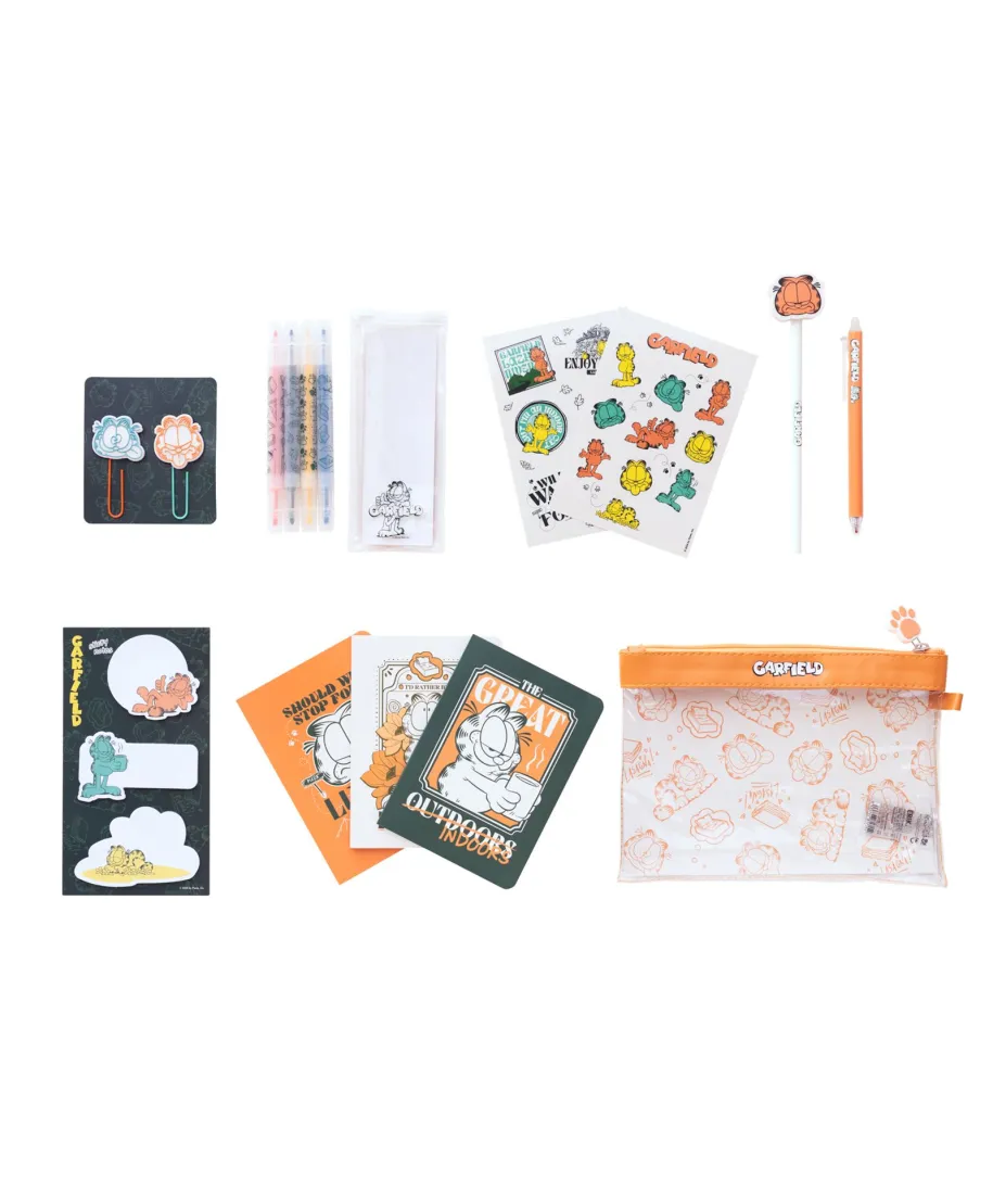 Garfield zestaw przyborów szkolnych Zestaw szkolny z motywem Garfielda 3 zeszyty A6, piórnik z zakreślaczami, długopis, ołówek, karteczki, spinacze, naklejki. Szczegóły techniczne Wymiary opakowania: 22 x 16 x 3 cm Materiał: PU + PVC Zamknięcie: zamek błyskawiczny Ilość elementów: 12 Oryginalny, licencjonowany produkt idealny zestaw do szkoły lub na prezent.