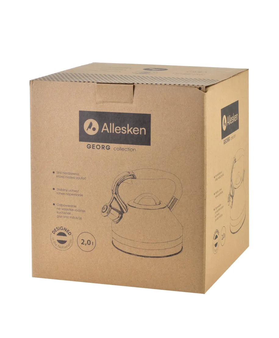 Przedstawiamy czajnik GEORG marki ALLESKEN o pojemności 2,0 litra . doskonały wybór dla każdej kuchni. Czajnik GEORG został wykonany z wysokiej jakości stali nierdzewnej, co zapewnia jego wytrzymałość i elegancki wygląd. Dzięki nowoczesnemu designowi i praktycznym funkcjom, czajnik GEORG staje się niezastąpionym elementem każdej kuchni. Główne cechy produktu:Materiał: wysokiej jakości stal nierdzewna, odporna na rdzewienie i korozję. Pojemność: 2,0 litra, idealna dla większych rodzin i gości. Ergonomiczny uchwyt: zapewnia wygodne i bezpieczne użytkowanie. Gwizdek: informuje o zagotowaniu wody, zapewniając wygodę i bezpieczeństwo. Stylowy design: nowoczesny wygląd, który doskonale komponuje się z wystrojem każdej kuchni.Dlaczego warto wybrać czajnik GEORG? Wytrzymałość: solidna konstrukcja ze stali nierdzewnej gwarantuje długotrwałe użytkowanie. Łatwość czyszczenia: stal nierdzewna jest łatwa do utrzymania w czystości, co pozwala na długotrwałe użytkowanie bez problemów. Bezpieczeństwo: stal nierdzewna nie reaguje z wodą, zapewniając zdrowe i bezpieczne użytkowanie. Wybierz czajnik GEORG 2,0L, aby cieszyć się niezawodnością, elegancją i funkcjonalnością w swojej kuchni każdego dnia. Średnica dna: 19cm Wysokość z rączką: 22cm