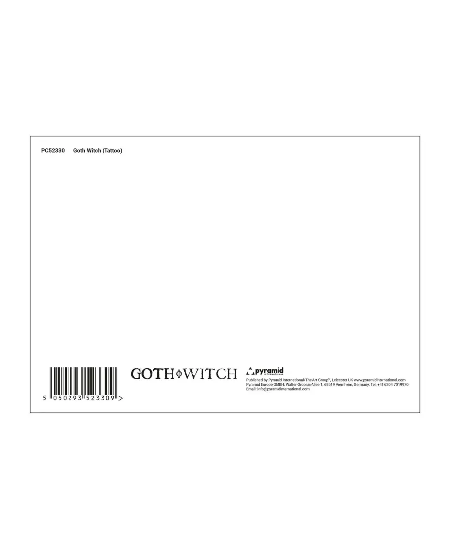 Goth Witch Tattoo - pocztówka Stylowa pocztówka z motywem gotyckiego tatuażu przedstawiającego czarownicę. Idealna dla miłośników mrocznych klimatów i alternatywnej sztuki. Doskonale sprawdzi się jako element kolekcji lub wyjątkowy gadżet na prezent. Jej unikatowy design z pewnością przypadnie do gustu fanom gotyckiej estetyki, którzy cenią sobie nietuzinkowe dodatki. Wyraź swoją indywidualność dzięki tej pocztówce. Szczegóły techniczne: Wymiary: 14,8 x 10,5 cm Materiał: papier wysokiej jakości Druk: pełnokolorowy Oryginalny, licencjonowany produkt.