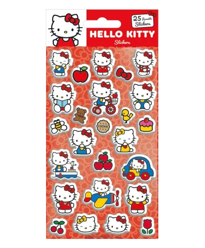 Hello Kitty and Mimmy zestaw naklejek Zestaw 25 naklejek winylowych wielokrotnego użytku z grafikami Hello Kitty i Mimmy. Idealne do dekoracji zeszytów, laptopów, prezentów. Styl kawaii, pastelowe kolory. Świetny produkt do oferty dziecięcej i młodzieżowej. Szczegóły techniczne: Ilość: 25 sztuk Wymiary arkusza: 19,5 x 9,5 cm Rodzaj: winylowe, wielokrotnego użytku Licencjonowany produkt Oficjalna licencja Hello Kitty Sanrio.