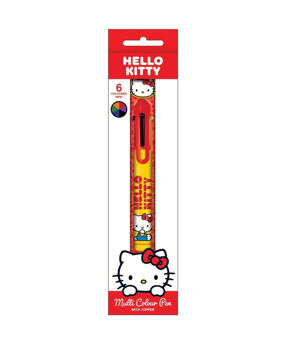 Hello Kitty Favourite Things długopis wielokolorowy Kolorowy długopis z motywem Hello Kitty, zawierający 6 kolorów tuszu, Z ozdobnym topperem 3D i trwałym nadrukiem idealny dla dzieci i fanów Sanrio, Szczegóły techniczne Ilość kolorów: 6 Motyw: Hello Kitty Materiał: Plastik Topper: ozdobny, 3D Produkt licencjonowany oryginalny gadżet Hello Kitty,