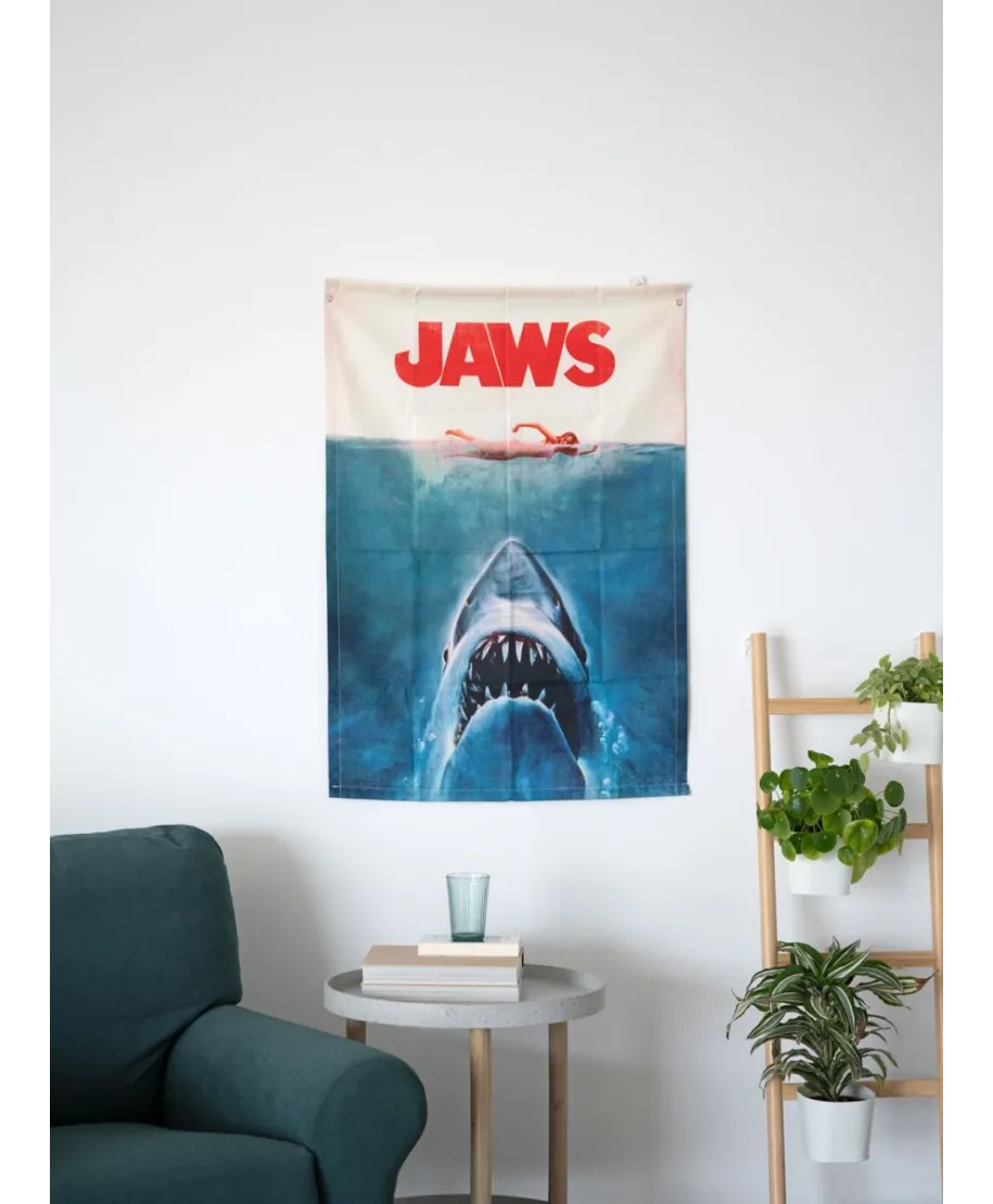 Jaws Szczęki - baner Baner inspirowany klasycznym filmem "Szczęki" to idealny gadżet dla fanów kultowych produkcji filmowych. Wykonany z trwałej tkaniny poliestrowej, może być używany zarówno wewnątrz, jak i na zewnątrz. Dzięki dwóm systemom mocowania, w tym otworom na rogach i możliwości użycia pręta, baner jest łatwy w zawieszeniu i świetnie prezentuje się na ścianie. Jego imponujące wymiary 70 x 100 cm sprawiają, że staje się centralnym elementem dekoracji. To doskonały produkt promujący kultowy film i przyciągający uwagę fanów. Szczegóły techniczne: Wymiary: 70 x 100 cm Materiał: 100% poliester Dwa systemy mocowania: otwory i szew na górze Licencjonowany produkt Oryginalny, licencjonowany produkt z oficjalnym motywem filmowym, idealny jako prezent dla fanów klasyki filmowej.