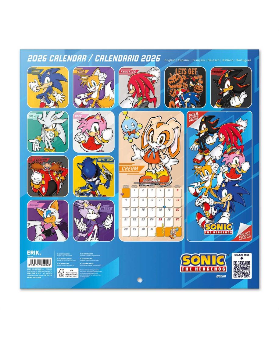 Jeż Sonic oficjalny kalendarz na ścianę na 2026rok Oryginalny i licencjonowany kalendarz, posiada 12 rozkładanych stron o wymiarach 30x60 cm. Na każdej z kart znajduje się duża fotografiaoraz czytelne kalendarium z miejscem na notatki. W kalendarzu znajduje się 12 unikalnych zdjęć dla każdego miesiąca + plakat. Okładki wykonane są z papieru powlekanego matowego i laminowanego o gramaturze 250 g/m2, wnętrze z papieru powlekanego matowego o gramaturze 150 g/m2. Nagłówki są w 6 językach:angielski, hiszpański, francuski, włoski, niemiecki i portugalski. Oprawa zszywkowa. Złożony kalendarz 30x30 cm. Rozłożony kalendarz 30x60 cm. Zawiera otwór 5 mm do zawieszenia na ścianie.