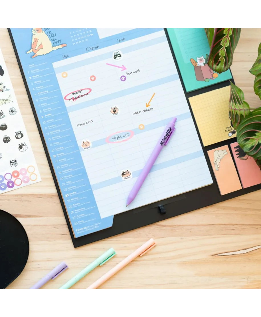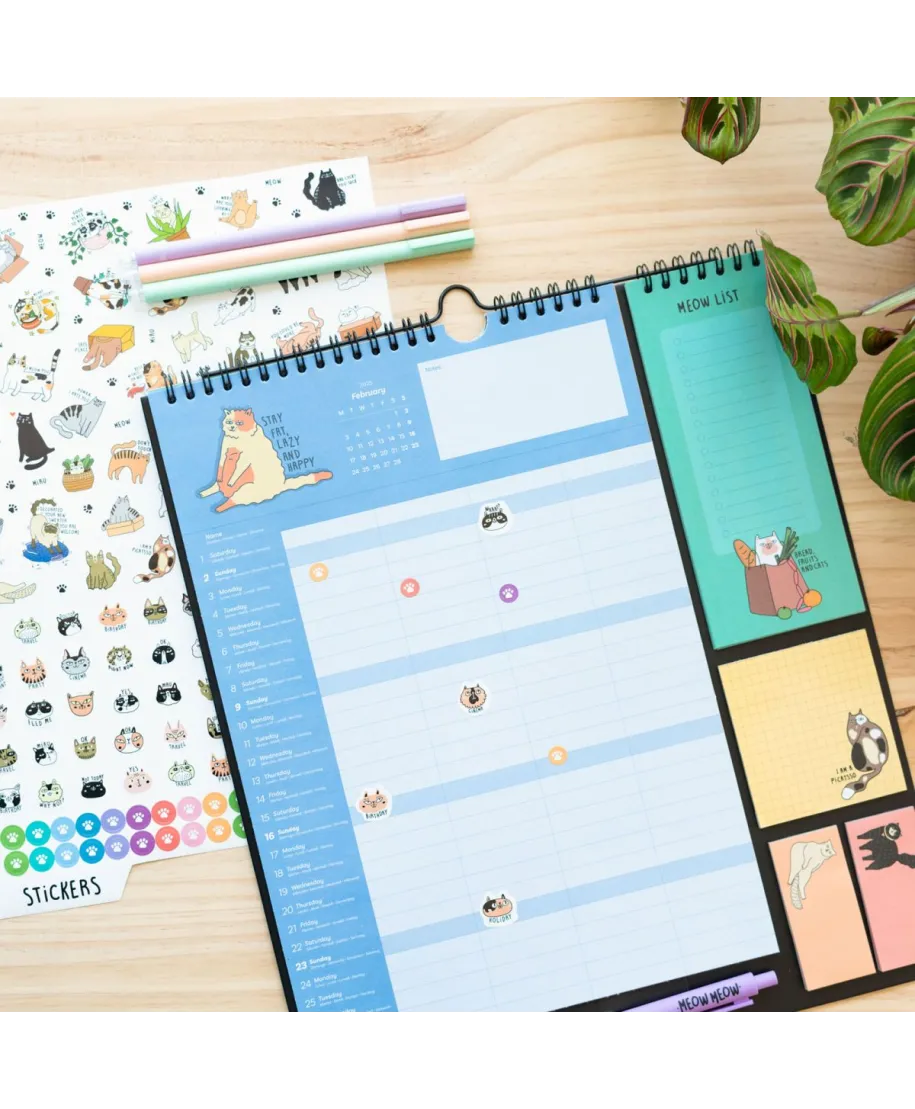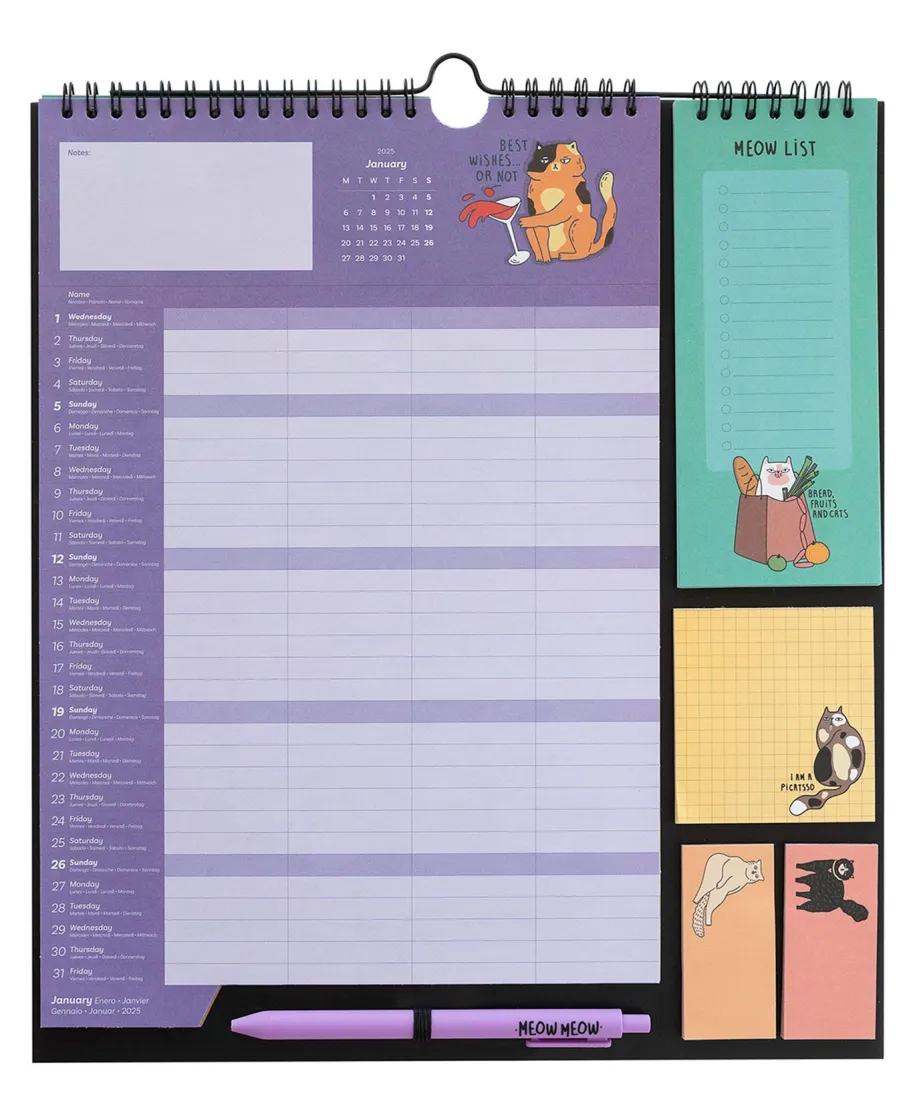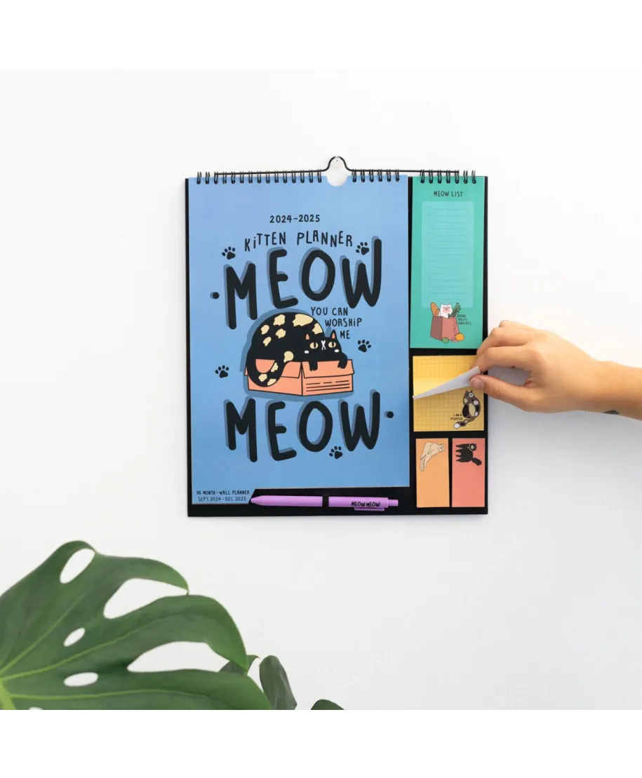 Planer na ścianę Kitten Meow Meow na 2024/2025 Ścienny kalendarz planer na cały rok. Kalendarz planowania ma wymiary 29,5x34 cm, zawiera 16 miesięcy (od września 2024 r. do grudnia 2025r.) Miejsce na zapiski podzielone jest na kolumny. Oprócz kalendarza planowania dostępnych jest kilka akcesoriów takich jak: kartki na listę zakupów kartkisamoprzylepne, arkusze naklejek do kalendarza, długopis. Języki nagłówków: angielski, hiszpański, francuski, włoski i niemiecki. Szczegóły techniczne: Wymiary kalendarza:29,5x34cm