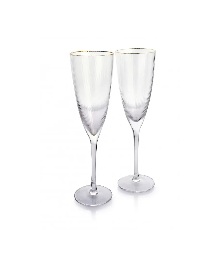 Komplet dwóch kieliszków do szampana z serii Mada, wykonany ze szkła z ozdobnym złotym rantem.