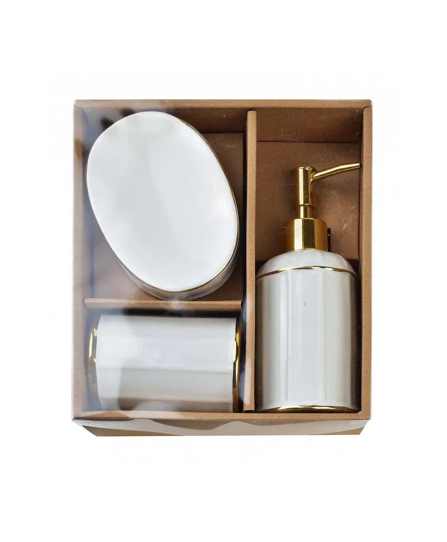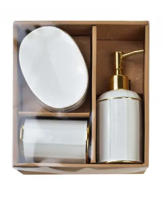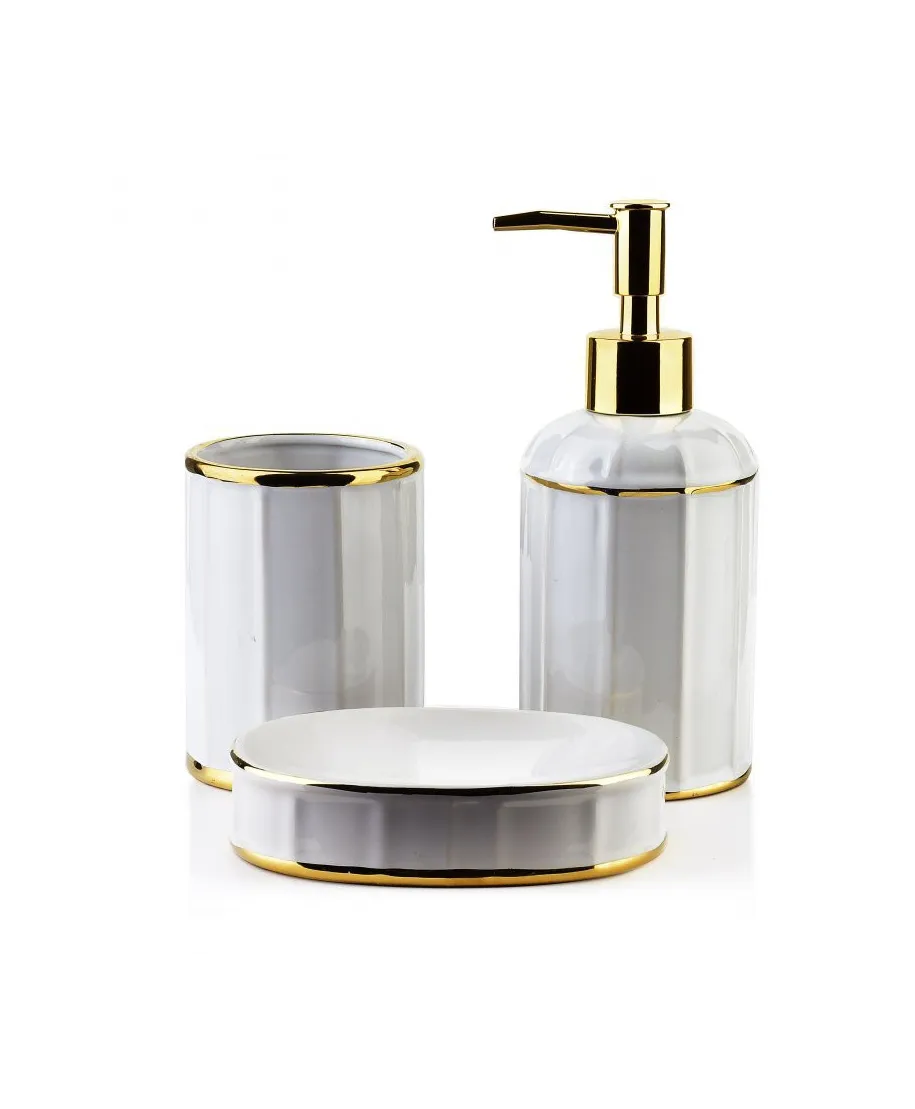Komplet łazienkowy z kolekcji CIRI WHITE marki BATHLAB by MONDEX. Ceramiczny 3 częściowy komplet w kolorze białym ze złotymi rantami! Zestaw łazienkowy CIRI jest idealny do każdej nowoczesnej łazienki. Nowoczesny design dodaje charakteru Twojej przestrzeni, zapewniając jednocześnie długotrwałą