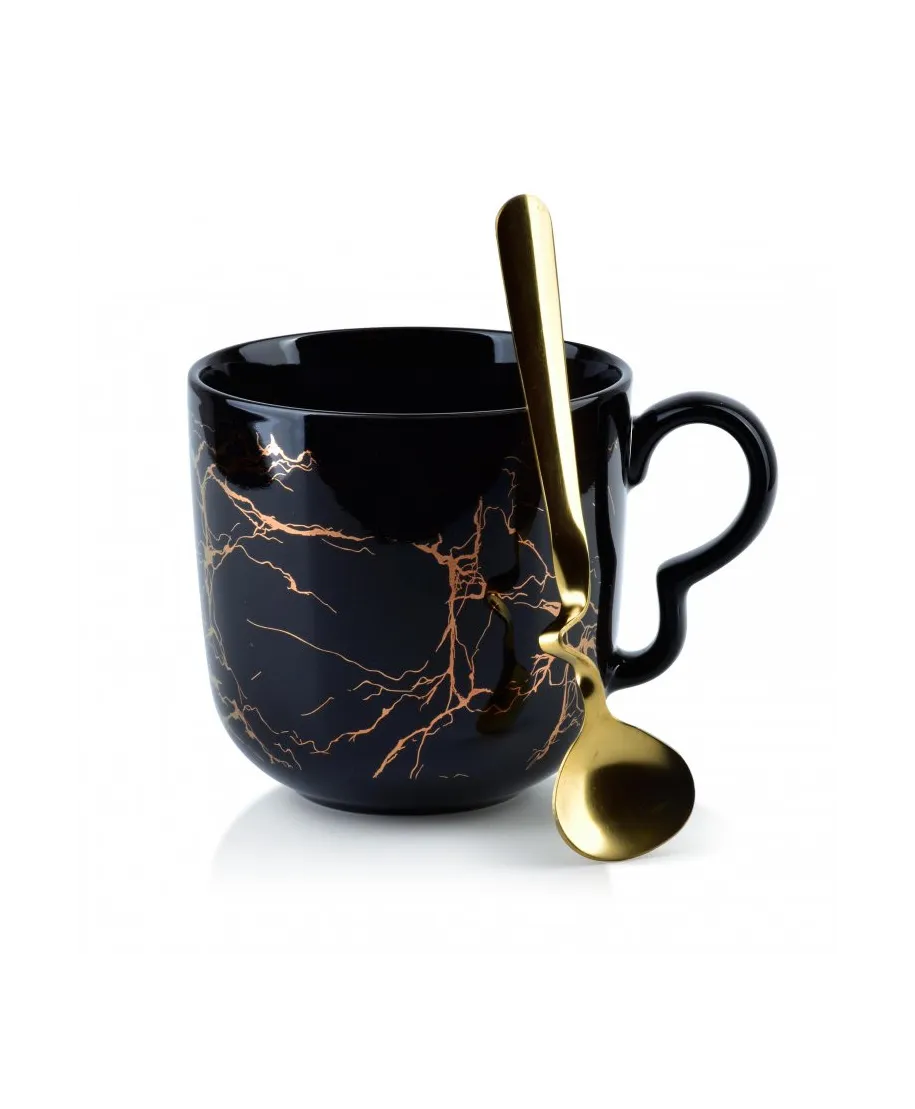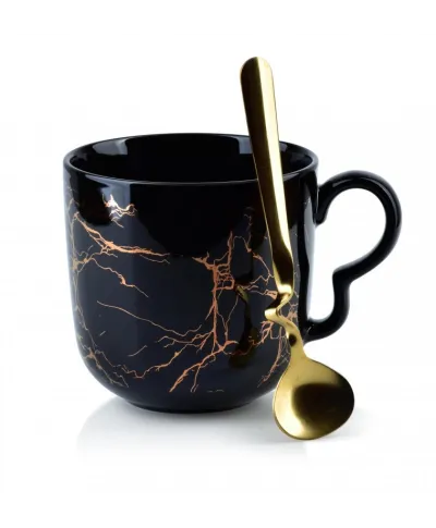 Duży kubek wykonany z porcelany w kolorze czarnym zdobiony złotym dekorem w formie marmuru.