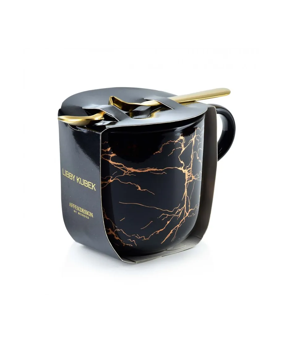 Przepiękny porcelanowy kubek z serii LIBBY. Mocny czarny kolor ze złotym akcentem prezentuje się zjawiskowo. Posiada czarne unikatowe ucho. W zestawie ze złotą łyżeczką. Zapakowany w elegancką papierową obejmę.