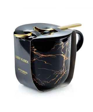 Kubek w zestawie posiada stalową łyżeczkę o oryginalnym kształcie w kolorze matowego złota.