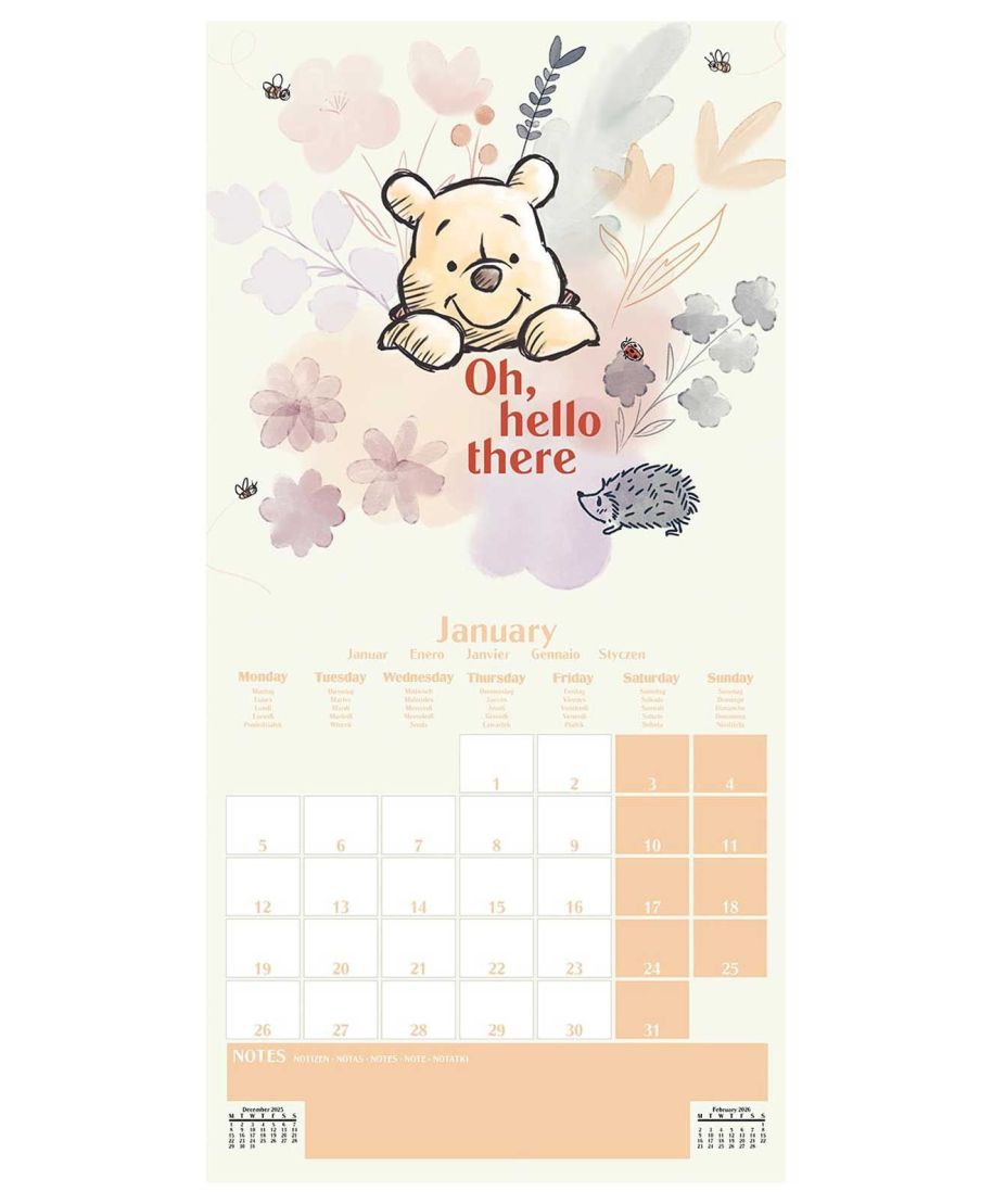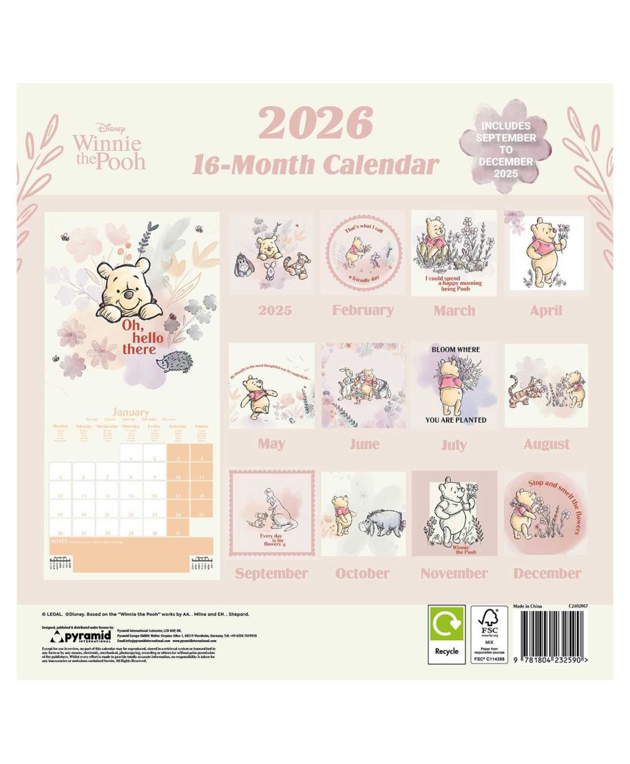 Kubuś Puchatek oficjalny kalendarz na ścianę na 2026 rok Numer katalogowy: C2402867 Producent: Pyramid International Oryginalny i licencjonowany kalendarz, posiada 12 rozkładanych stron o wymiarach 30x60 cm. Na każdej z kart znajduje się duża fotografia oraz czytelne kalendarium z miejscem na notatki. W kalendarzu znajduje się 12 unikalnych zdjęć dla każdego miesiąca. Okładki wykonane są z papieru powlekanego matowego i laminowanego o gramaturze 250 g/m2, wnętrze z papieru powlekanego matowego o gramaturze 150 g/m2. Nagłówki są w 6 językach: angielski, hiszpański, francuski, włoski, niemiecki i polski. Oprawa zszywkowa. Złożony kalendarz 30x30 cm. Rozłożony kalendarz 30x60 cm. Zawiera otwór 5 mm do zawieszenia na ścianie.