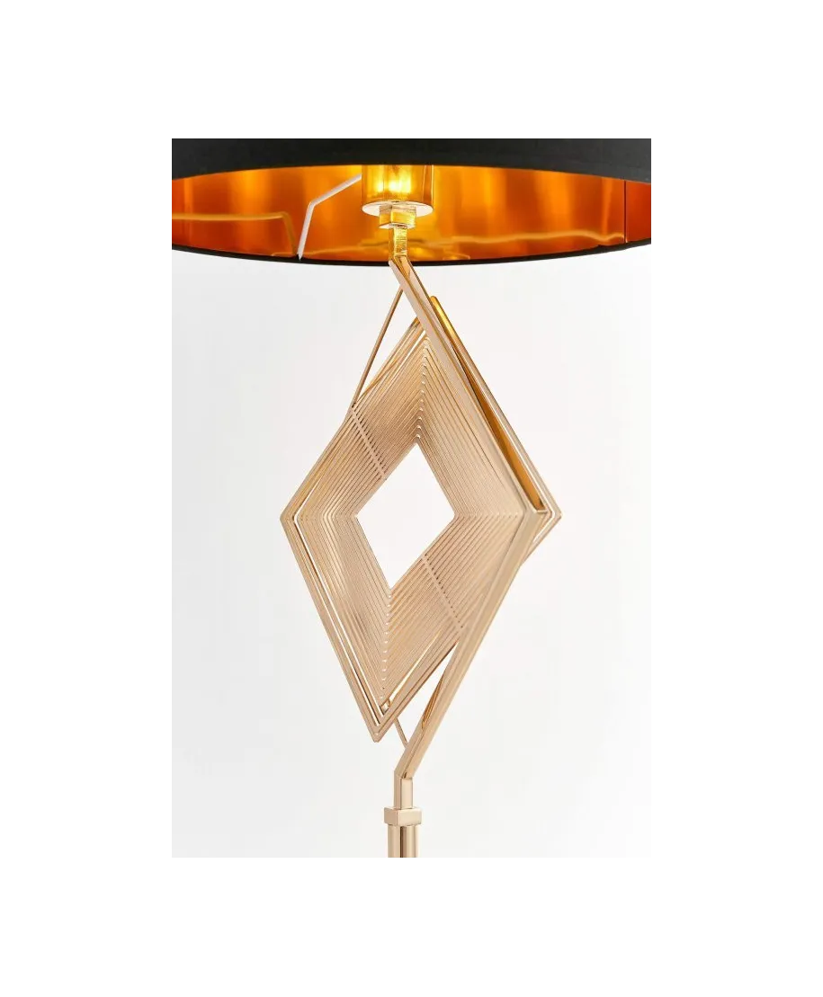 Lampa ta, to połączenie sporego abażura o klasycznym kształcie, którego konstrukcja wykonana została na bazie koła. Powleczono ją materiałem w kolorze głębokiej czerni, kontrastującej z kunsztownym złotym wnętrzem pokrytym błyszczącą powłoką. Tuż pod abaż