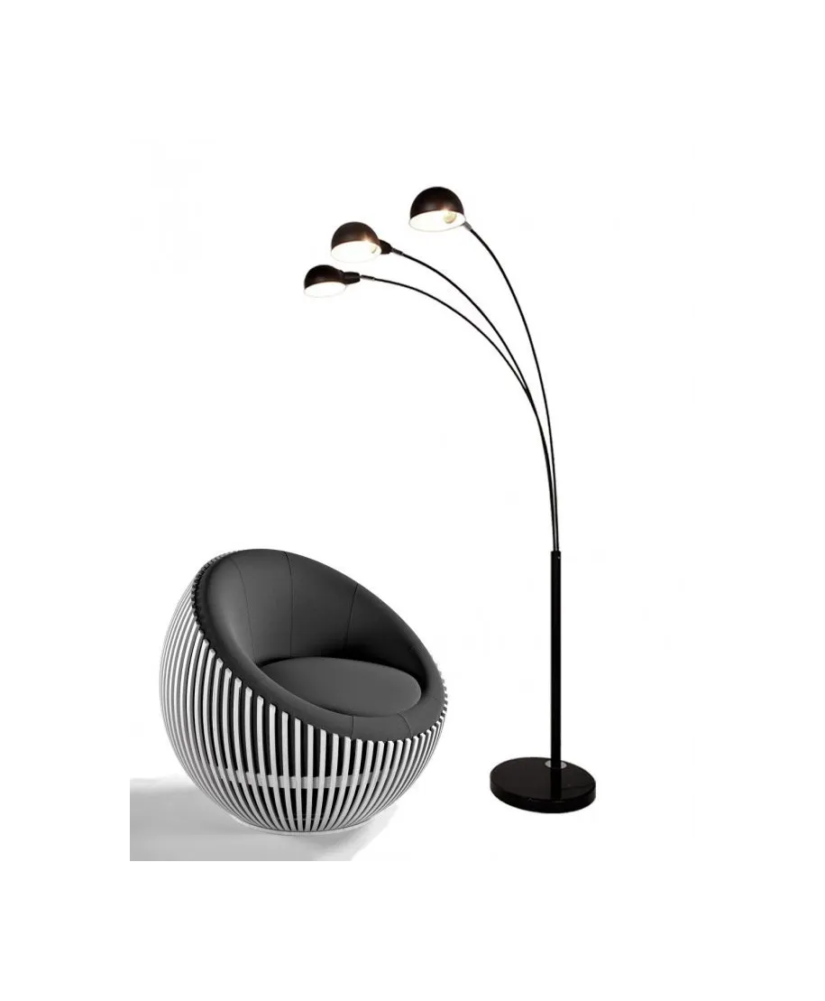 Spora wysokość lampy oraz trzy punkty świetlne pozwolą na optymalne doświetlenie wnętrza. Czarna oprawa trzech metalowych kloszy przyciąga swoją uniwersalnością, zwłaszcza jeśli ktoś poszukuje idealnej lampy podłogowej do salonu lub sypialni.