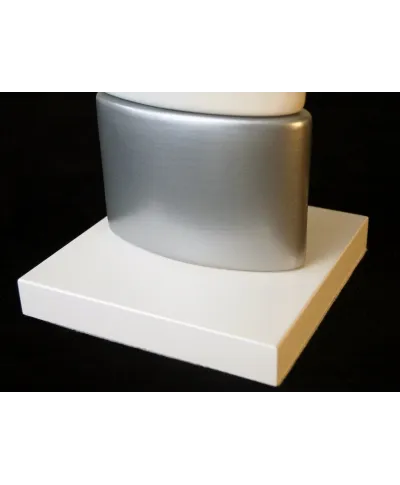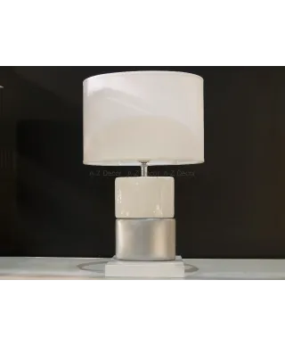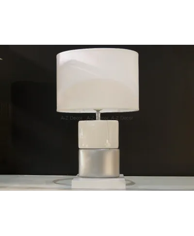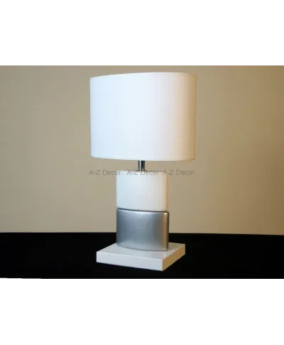 Lampka nocna wykonana z białej i srebrnej ceramiki o wymiarach 25x15x40 cm. Abażur biały, owalny o wymiarach 25x15x17 cm. Podstawa drewniana lakierowana na biało, zabezpieczona od spodu materiałem chroniacym meble przed zarysowaniami.Srebrna ceramika le