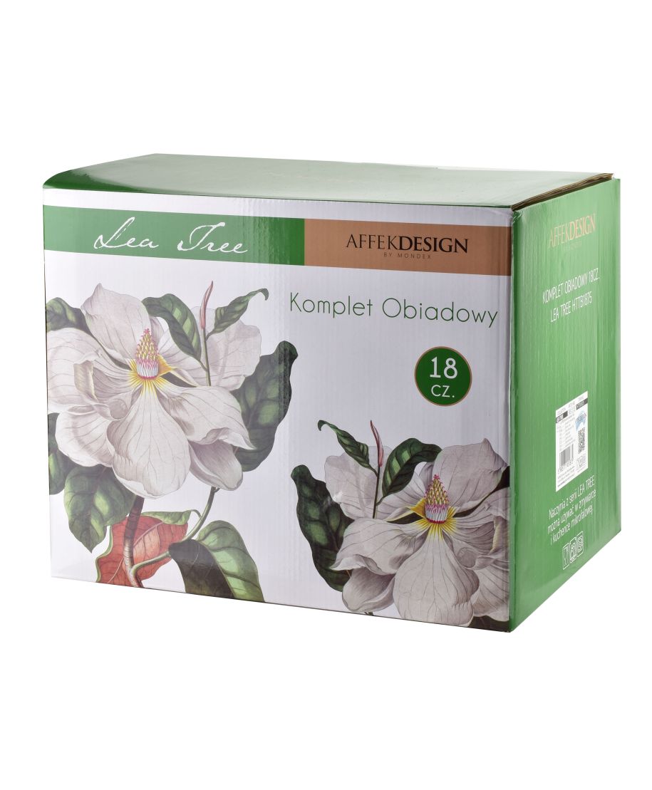 Uniwersalny, klasyczny w formie komplet obiadowy składający się z 18 elementów to elegancka propozycja zdobiona subtelnym motywem kwiatów magnolii. Wykonany z wysokiej jakości porcelany, zachwyca delikatnym wzornictwem w dominującej kolorystyce bieli i zieleni, dzięki czemu doskonale wpisuje się zarówno w codzienne, jak i odświętne nakrycie stołu. W zestawie znajdują się talerze obiadowe o średnicy 26 cm, talerze deserowe o średnicy 21 cm oraz praktyczne miski o średnicy 15 cm, po sześć sztuk każdego rodzaju. Zastawa jest nie tylko piękna, ale i funkcjonalna . nadaje się do mycia w zmywarce oraz używania w kuchence mikrofalowej. Całość zapakowana została w estetyczny, kolorowy box, co sprawia, że komplet doskonale sprawdzi się również jako elegancki prezent.