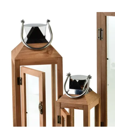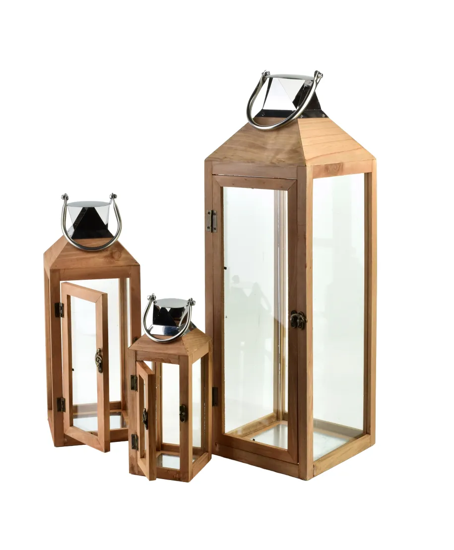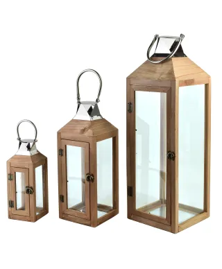 Komplet 3 latarni LOKKE Materiał: Drewno, szkło i metalowy uchwytKolorystyka: Styl rustykalny lub glamour z akcentami złota (gold) Zastosowanie: Dekoracja wnętrz, balkonów, tarasów, ogrodów Zawartość zestawu: 2 sztuki latarni . mniejsza i większaZastosowanie świec: Przeważnie przystosowane do świec typu tealight lub słupkowych (nie elektrycznych) cechy:Otwierane drzwiczki dla łatwego umieszczania świec Przeszklenia z czterech stronMetalowy daszek z otworami wentylacyjnymi Uchwyt do zawieszenia lub przenoszeniaZastosowania:Dekoracja stołu, komody lub parapetu. Element wystroju na weselach, przyjęciach, w stylu boho lub vintage. Świetnie komponują się z sezonowymi dekoracjami (np. świąteczne, jesienne) 20x20x62 15x15x42 10x10x28cm