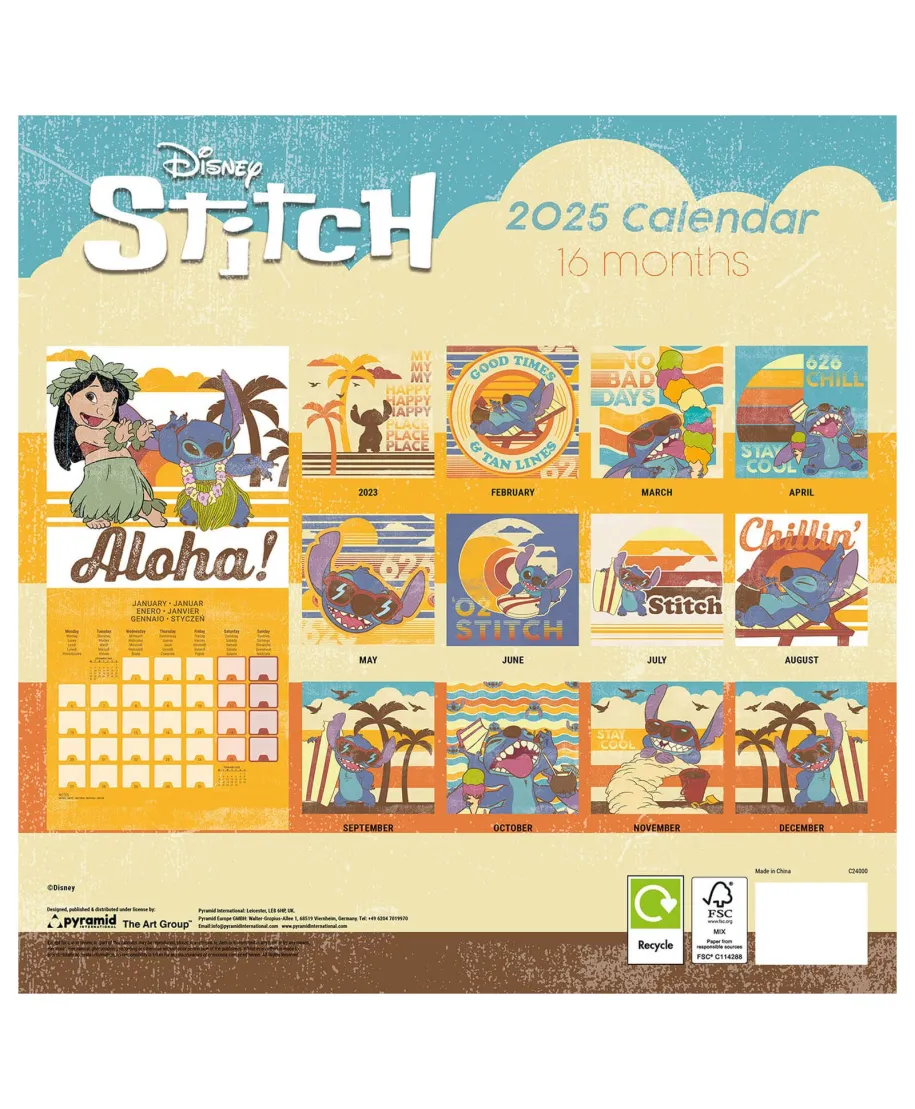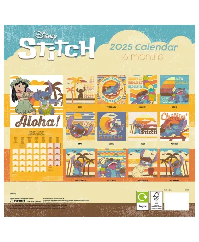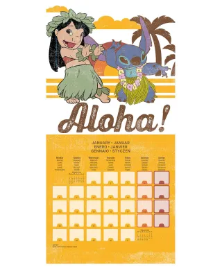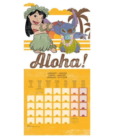 Lilo and Stitch oficjalny kalendarz na ścianę na 2025rok Oryginalny i licencjonowany kalendarz, posiada 12 rozkładanych stron o wymiarach 30x60 cm. Na każdej z kart znajduje się duża fotografiaoraz czytelne kalendarium z miejscem na notatki. Okładki wykonane są z papieru powlekanego matowego i laminowanego o gramaturze 250 g/m2, wnętrze z papieru powlekanego matowego o gramaturze 150 g/m2. Nagłówki są języku angielskim, niemieckim, hiszpańskim, francuskim, włoskim i polskim. Oprawa zszywkowa. Złożony kalendarz 30x30 cm. Rozłożony kalendarz 30x60 cm. Zawiera otwór 5 mm do zawieszenia na ścianie.