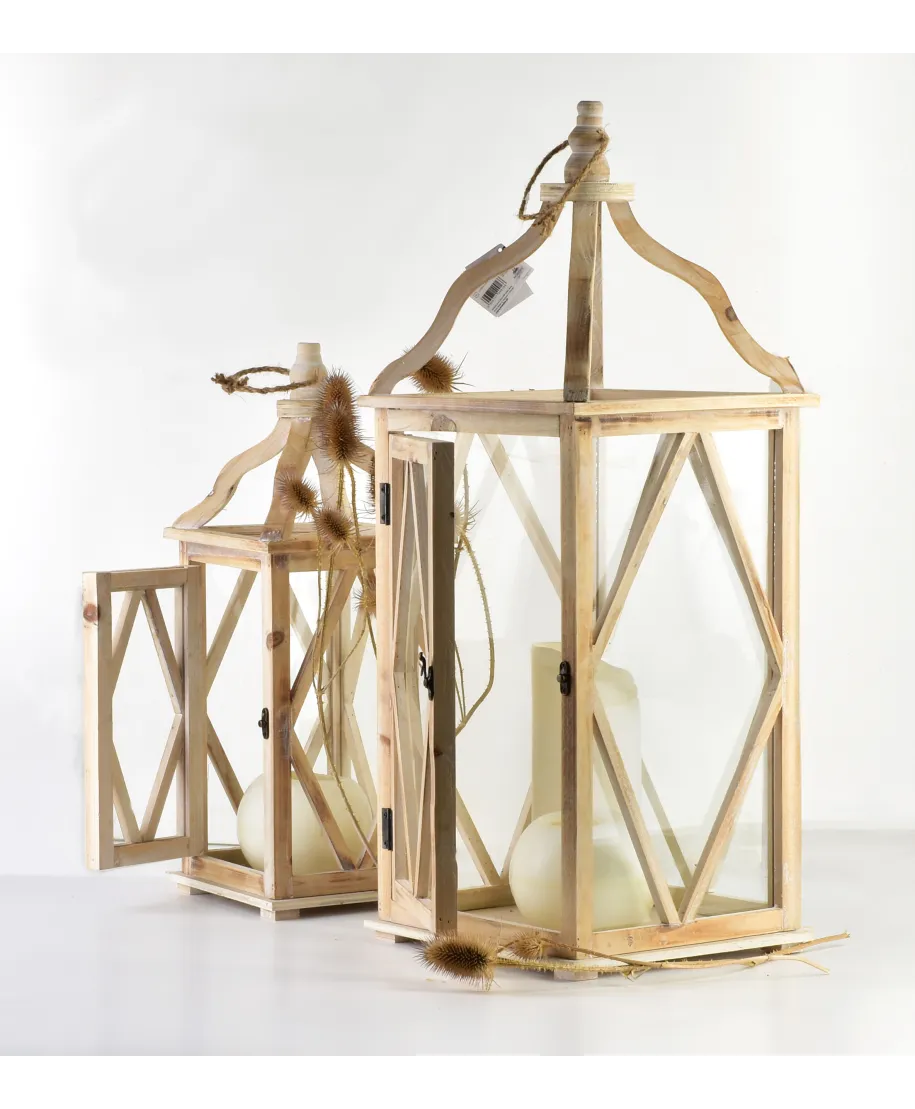LOKKE Komplet 2 Latarni to elegancki zestaw dwóch latarni wykonanych z jasnego drewna, który doskonale łączy prostotę formy z naturalnym urokiem materiału. Większa latarnia ma wymiary 26,5 26,5 70 cm, a mniejsza 19 19 50 cm. Ich proporcjonalna, smukła sylwetka w połączeniu z przeszklonymi ściankami sprawia, że doskonale eksponują światło i stanowią wyjątkowy element dekoracyjny.Drewniana konstrukcja w naturalnym, jasnym wybarwieniu nadaje im świeżości i uniwersalności, dzięki czemu pasują zarówno do wnętrz w stylu skandynawskim, rustykalnym czy boho, jak i do bardziej klasycznych aranżacji. Latarnie idealnie sprawdzają się jako ozdoba w salonie, na werandzie, balkonie czy w ogrodzie, wprowadzając ciepłą i przytulną atmosferę.Zestaw ten to nie tylko praktyczne źródło nastrojowego światła, ale również gustowny akcent, który podkreśli charakter każdej przestrzeni . zarówno w codziennym użytkowaniu, jak i podczas wyjątkowych okazji.