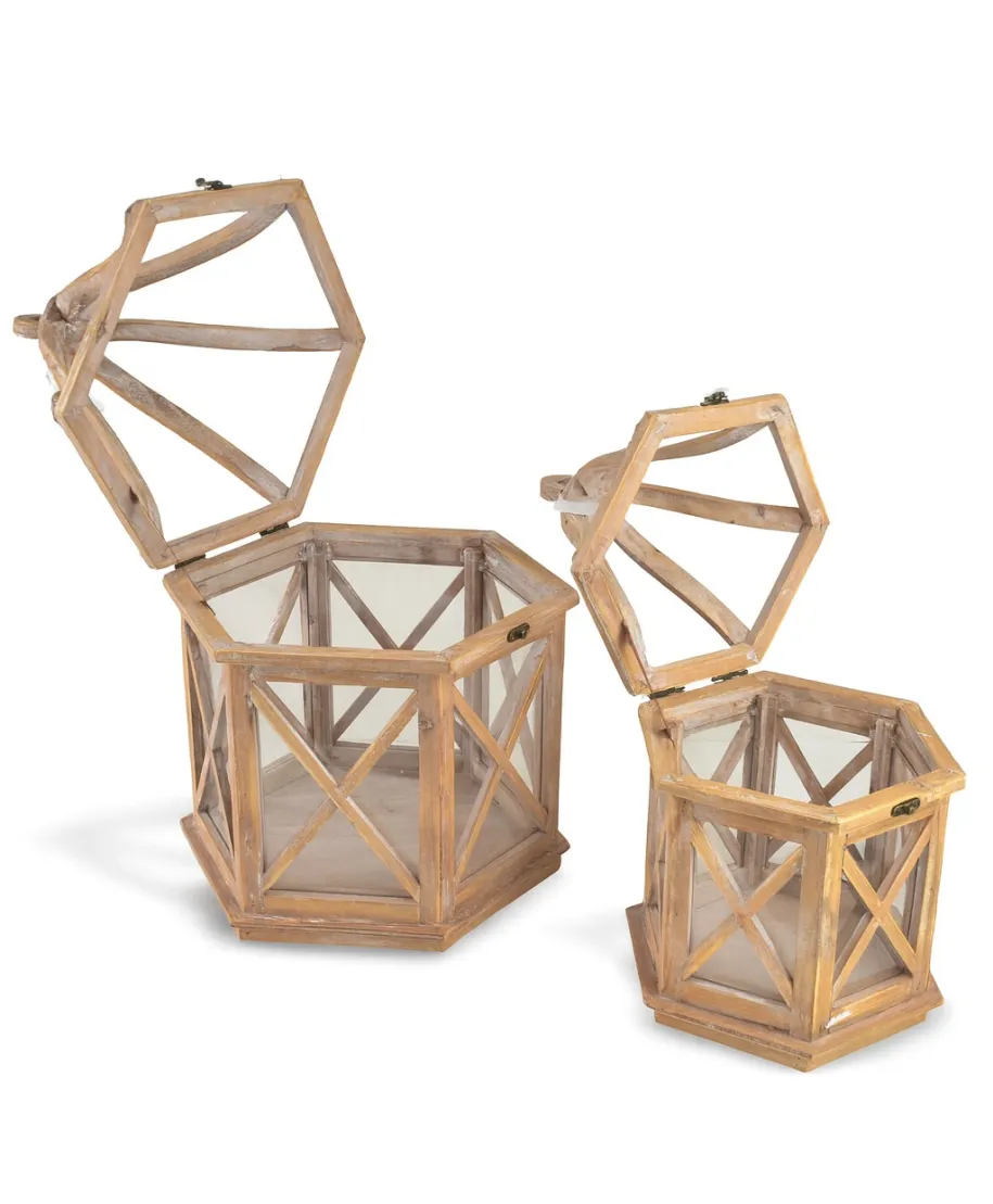 LOKKE Komplet 2 Latarni to stylowy zestaw dwóch dekoracyjnych latarni o unikalnym, heksagonalnym (sześciokątnym) kształcie, który wyróżnia je spośród tradycyjnych modeli i dodaje aranżacjom wyjątkowego charakteru. Większa latarnia ma wymiary 34 30 52 cm, a mniejsza 25,5 22 42 cm. Obie wykonane są z jasnego drewna, które nadaje całości lekkości, świeżości i naturalnego uroku.Szklane ścianki oraz subtelne detale pozwalają na pełne wyeksponowanie światła i dekoracji umieszczonych w środku. Górne otwieranie latarni zapewnia wygodny dostęp do wnętrza, umożliwiając łatwe rozmieszczenie świec, lampek LED czy sezonowych ozdób. Konstrukcja łączy w sobie elegancję i funkcjonalność, tworząc nastrojowe oświetlenie zarówno w domowych wnętrzach, jak i na zewnątrz . na tarasie, balkonie czy w ogrodzie.Dzięki swojej formie i kolorystyce, zestaw doskonale wpisuje się w aranżacje skandynawskie, rustykalne, boho czy klasyczne, dodając im ciepła i stylu. To wyjątkowa dekoracja, która przyciąga wzrok i wprowadza przytulną atmosferę do każdej przestrzeni.