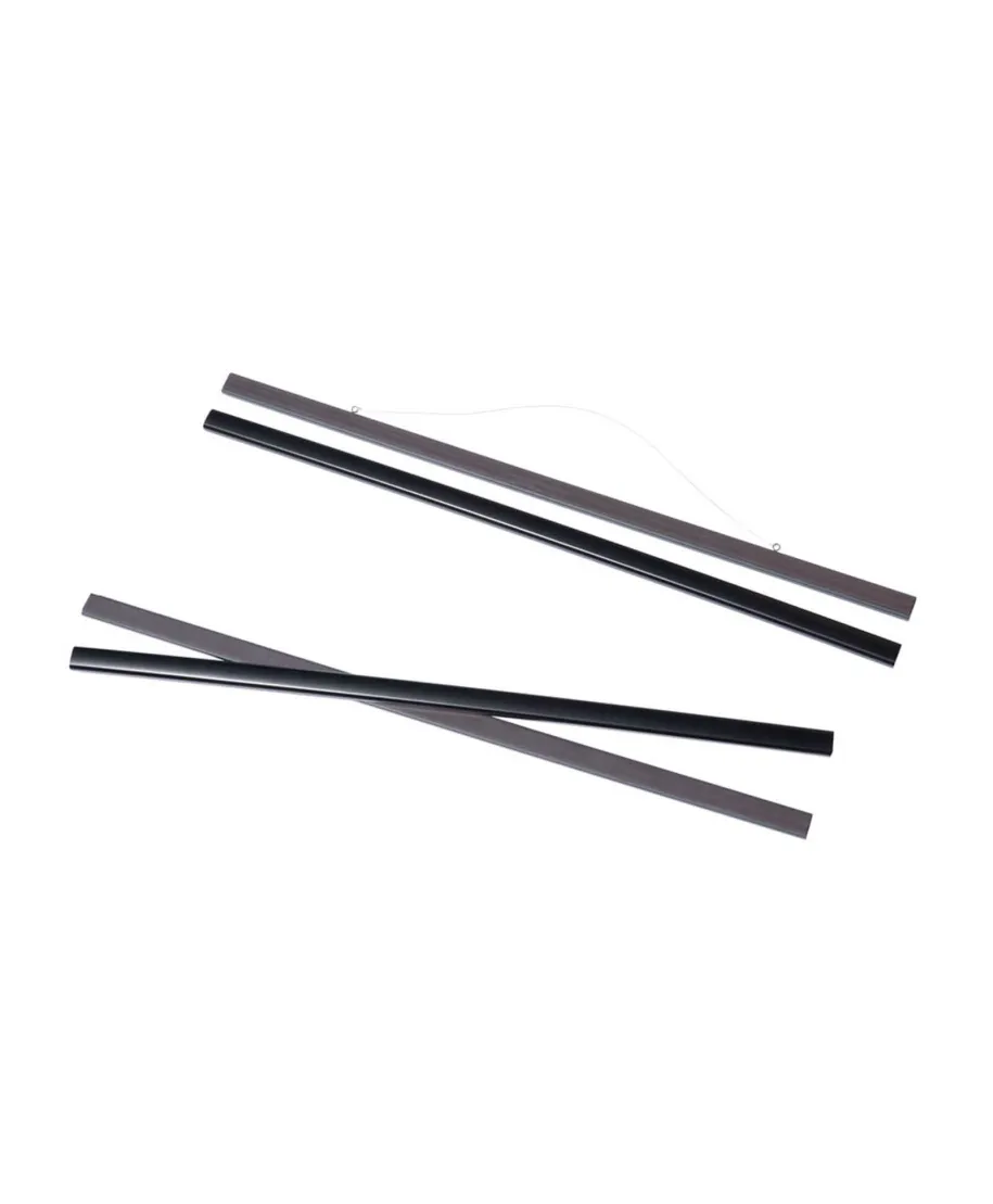 Czarny wieszak na plakaty z magnetyczną listwą Czarny wieszak na plakat to doskonały i tani sposób na powieszenie twojego plakatu na ścianie. Komplet składa się z czterech plastikowych listew z magnesem oraz linkisłużącej do powieszenia górnej listwy na gwoździu w ścianie. Za pomocą tego wieszaka możesz umieścić na ścianie plakaty o maksymalnej szerokości 61cm Szybki i prosty montaż plakat zatrzaśnij pomiędzy dwomalistwami z magnesem zarówno u góry jak i dołu plakatu, wbij gwoździk do ściany i powieś na nim plakat za pomocą żyłki zamocowanej nagórnej listwie - gotowe! Szczegóły techniczne: komplet czterech listew o długości 61cm przezroczysta żyłka do wieszania na górnej listwie