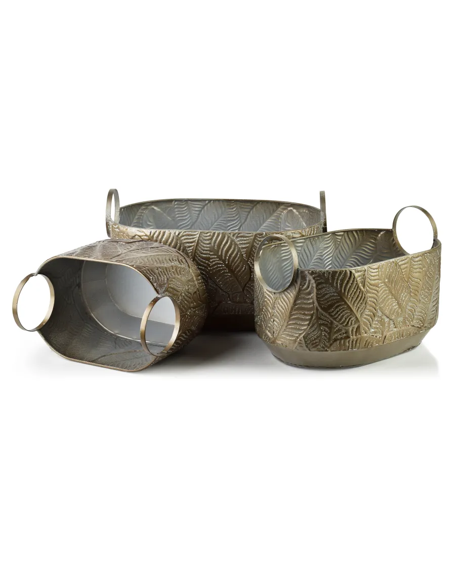 Komplet 3 osłonek MARINA LEAFMateriał: metalWykończenie: tłoczone liście, dekoracyjny wzórKolor: elegancki brązStyl: naturalny, etniczny, pasujący do wnętrz boho, rustykalnych i klasycznychZastosowanie: osłonki na doniczki, dekoracja stołu, półki czy tarasuDzięki zdobieniu w formie tłoczonych liści osłonki mają wyjątkowy charakter i świetnie komponują się z zielenią roślin. Brązowe wykończenie dodaje im ciepła i naturalności, a metalowa konstrukcja zapewnia trwałość. XL 31x48x24 L 26x40x21cm M 21x31x19,5cm