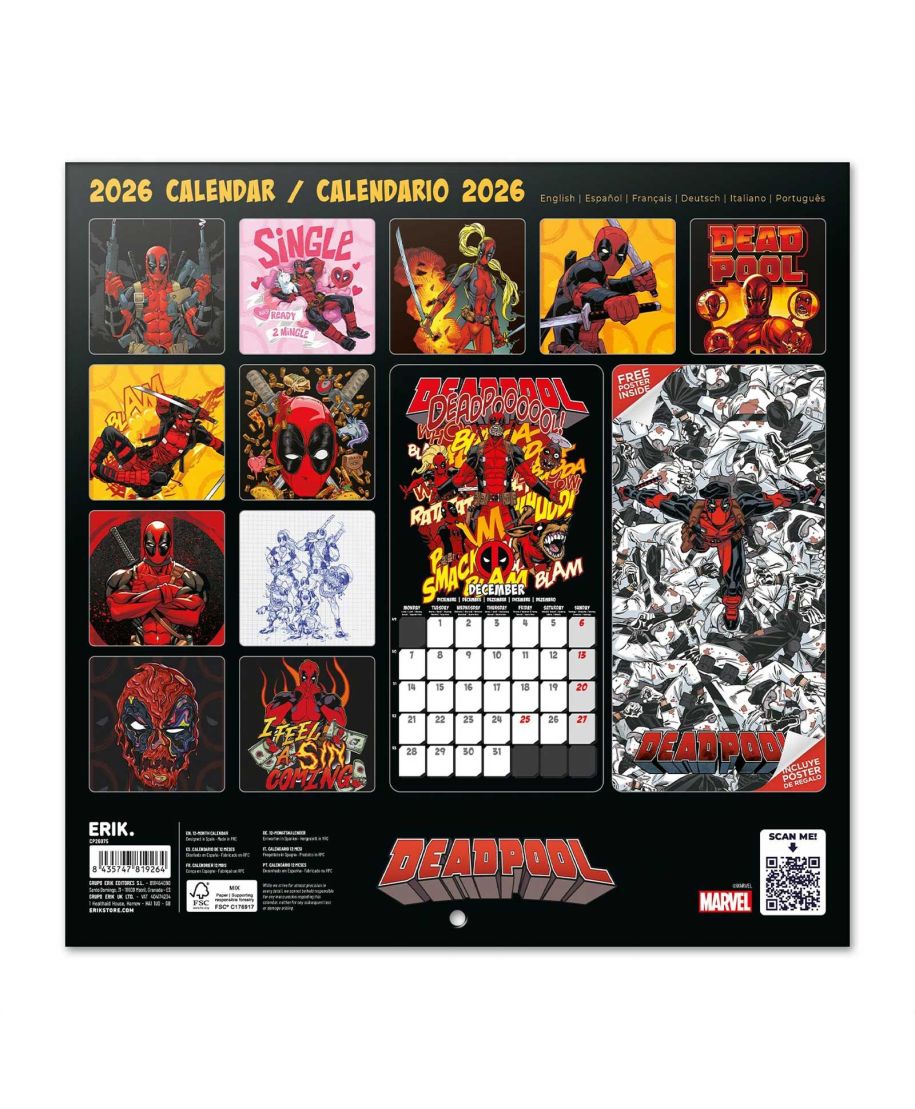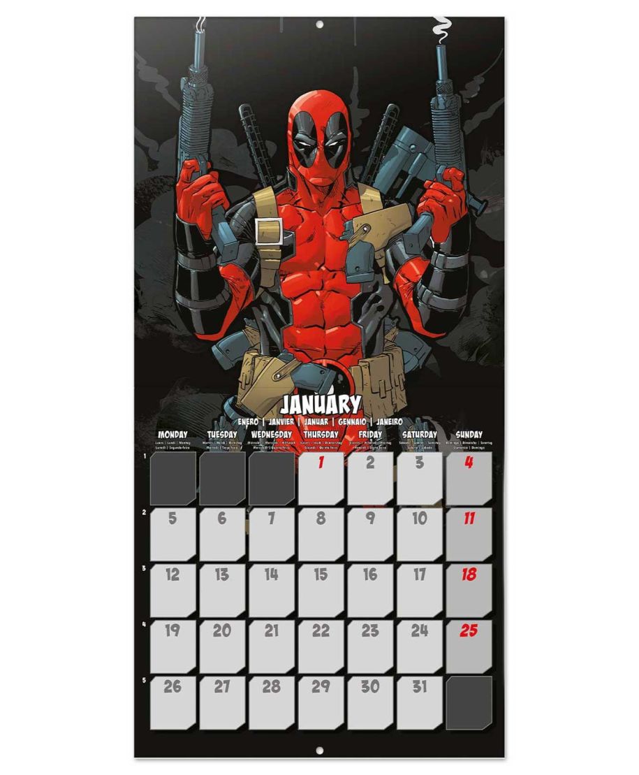 Marvel Deadpool oficjalny kalendarz na ścianę na 2026rok Oryginalny i licencjonowany kalendarz, posiada 12 rozkładanych stron o wymiarach 30x60 cm. Na każdej z kart znajduje się duża fotografiaoraz czytelne kalendarium z miejscem na notatki. W kalendarzu znajduje się 12 unikalnych zdjęć dla każdego miesiąca + plakat. Okładki wykonane są z papieru powlekanego matowego i laminowanego o gramaturze 250 g/m2, wnętrze z papieru powlekanego matowego o gramaturze 150 g/m2. Nagłówki są w 6 językach:angielski, hiszpański, francuski, włoski, niemiecki i portugalski. Oprawa zszywkowa. Złożony kalendarz 30x30 cm. Rozłożony kalendarz 30x60 cm. Zawiera otwór 5 mm do zawieszenia na ścianie.