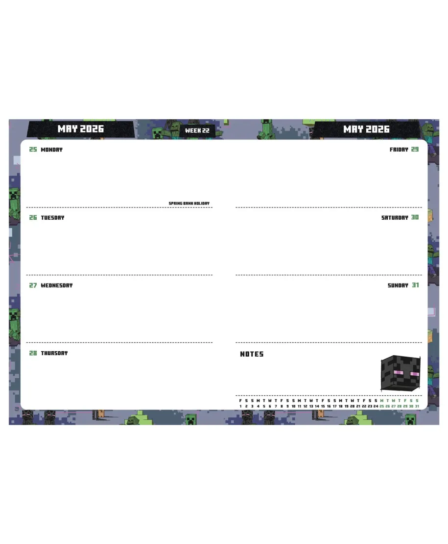 Kalendarz książkowy A5 Minecraft 2026 Organizer A5 z motywem Minecraft: twarda okładka, układ tygodniowy z miejscami na cele, notatki i adresy - idealny dla fanów planowania w stylu gry. Papier wysokiej jakości, ekologiczny design. Szczegóły techniczne: Format: A5 (ok. 15 × 21 cm) Układ: tygodniowy (Week-to-View) z miejscem na cele oraz stronami na notatki i adresy Ilość stron: 146 Okładka: twarda z grafiką Minecraft Papier: wysokiej jakości Opakowanie: eco-friendly (plastic-free) Licencjonowany produkt Autentyczny kalendarz Minecraft z oficjalną licencją.