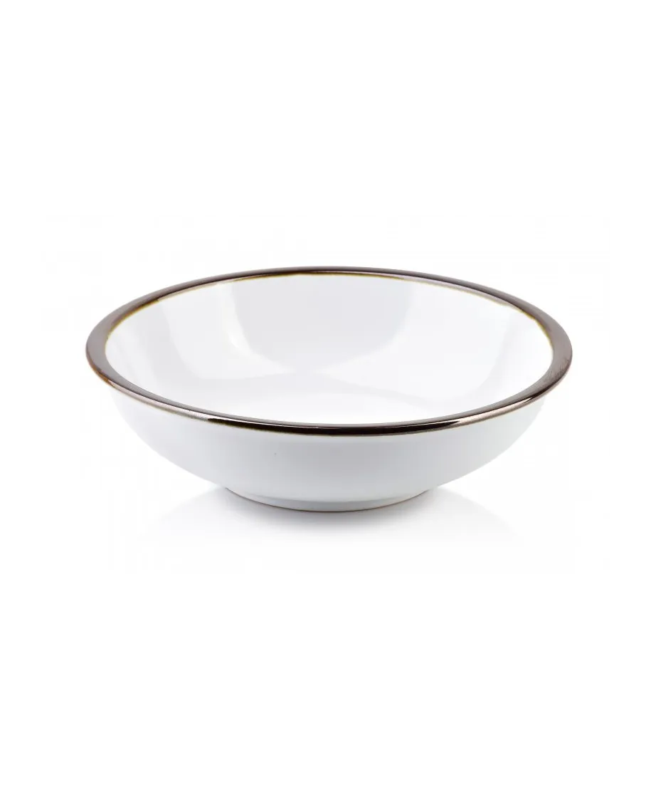 Miska porcelanowa z serii CAL. Zdobienie jest wykonane ręcznie w kolorze postarzanego złota. Pasek może się różnić na poszczególnych produktach. Nie należy myć w zmywarce.