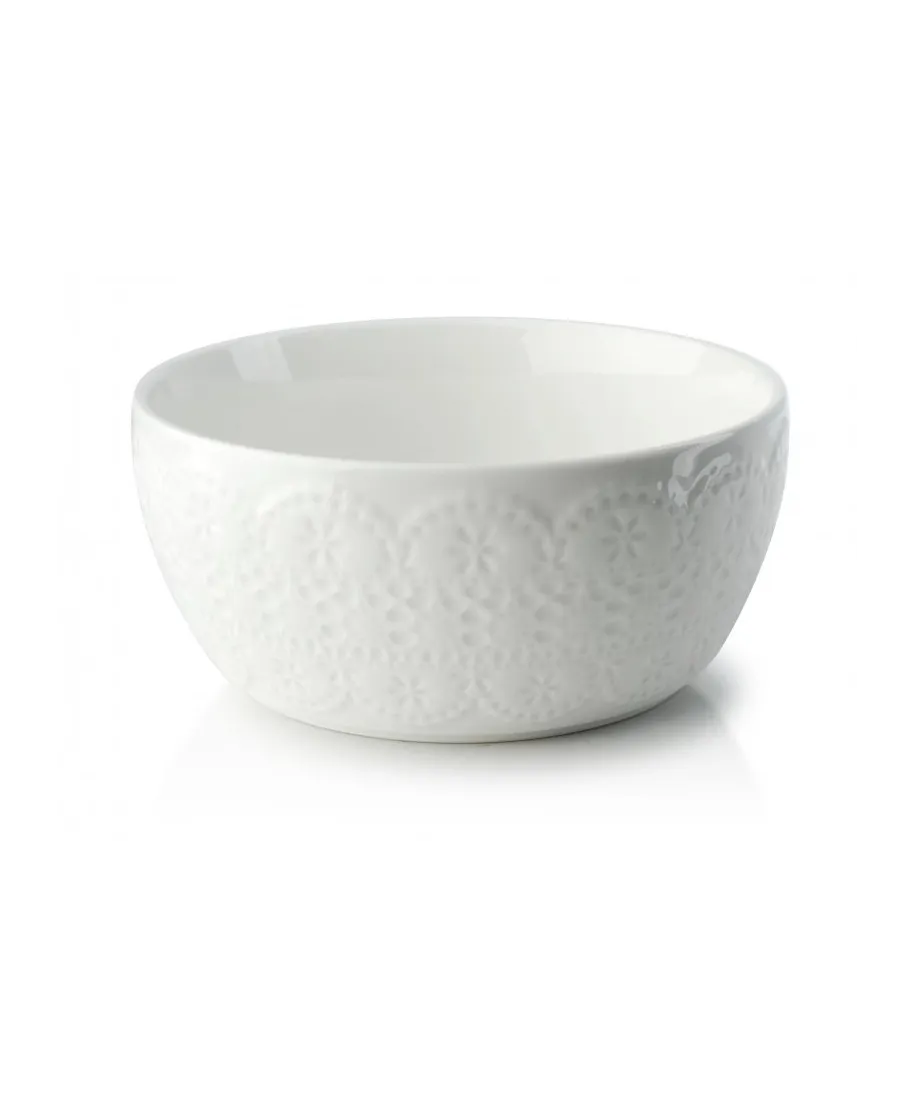 Miska porcelanowa w białym kolorze, ozdobiona wytłaczanymi, wypukłymi koronkami.