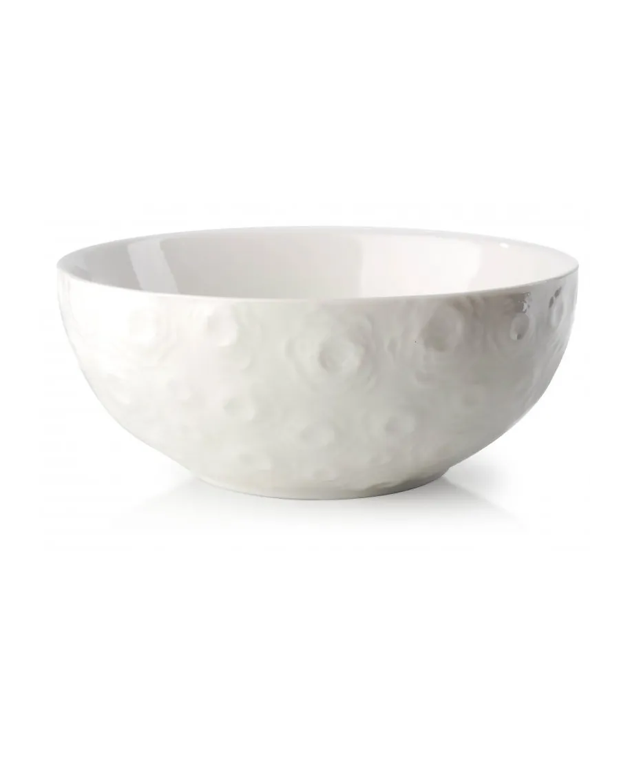 Miska porcelanowa w białym kolorze, ozdobiona wytłaczanymi, wypukłymi różyczkami.