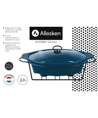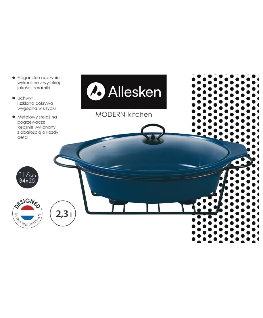 Naczynie z podgrzewaczem marki Allesken z serii MODERN KITCHEN poj. 2,3L, 34x25x17cm to serwowanie potraw na co dzień i od święta. . Kolor: granatowy, czarny stelaż\. Materiał: kamionka .\. Marka: Allesken\. Zastosowanie: serwowanie potraw\. Pojemność produktu: 2,3L . Wymiar: 34x25xh17cm\. Symbol: HTN5519,5905771405519 . Kolekcja: MODERN KITCHEN Naczynie jest idealne do serwowania najróżniejszych potraw. Stabilny stojak wykonany ze stali chromowanej umożliwia serwowanie gorącej potrawy.\Dzięki podgrzewaczom serwowane dania pozostaną ciepłe przez długi czas\Szklana pokrywa posiada ceramiczny uchwyt\Naczynie oraz pokrywę można myć w zmywarce\Stojak czyścić wilgotną ściereczką\Stojak posiada miejsce na umieszczenie świeczek typu tea-light (do zestawu NIE są\dołączone świeczki)