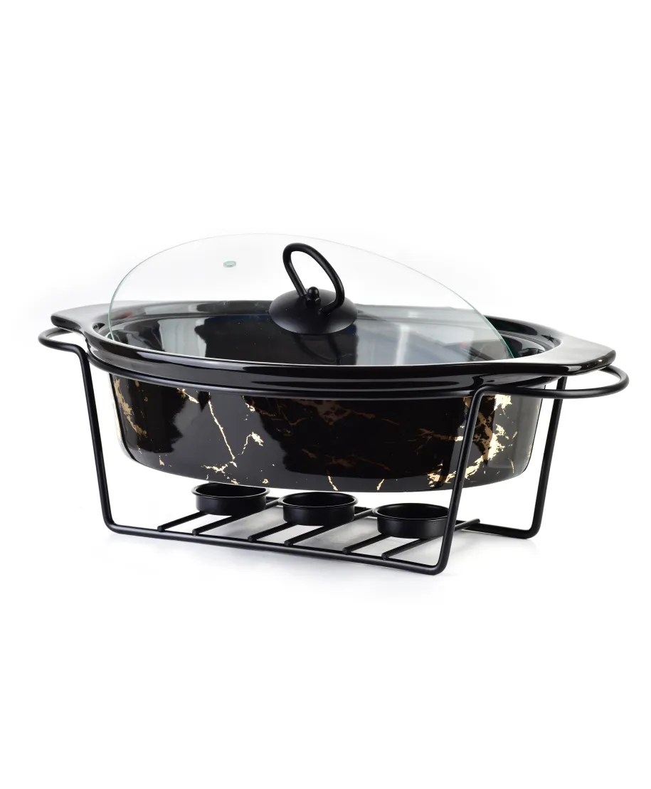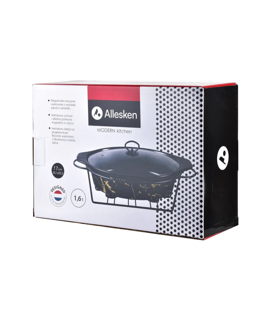 Owalne naczynie z podgrzewaczem marki Allesken by MONDEX z serii MODERN KITCHEN to idealne rozwiązanie do serwowania ciepłych potraw, które utrzymają swoją temperaturę. Wbudowane w metalowym stelażu miejsce na świeczki typu tea-light sprawia, że potrawy zostają ciepłe przez długi czas, co czyni ten produkt niezastąpionym podczas spotkań i przyjęć. Zestaw 3 elementów: naczynia ceramicznego, metalowego stelaża i szklanej pokrywy wykonany z wysokiej jakości materiałów. Naczynie zachwyca nowoczesnym designem, który świetnie wpasuje się w każdą jadalnię, dodając jej elegancji.Trwałe materiały, z których wykonano naczynie, gwarantują długotrwałe użytkowanie. Allesken by MONDEX łączy w sobie elegancję i funkcjonalność, oferując produkt, który pozwoli cieszyć się gorącymi potrawami przez cały czas trwania posiłku.Zestaw posiada eleganckie opakowanie, co sprawia że naczynie jest doskonałym upominkiem.Naczynia nie zaleca się myć w zmywarce, szklaną pokrywę myć ręcznie, stojak czyścić wilgotną ściereczką.Można używać w piekarniku w temperaturze do 140C.Nie można używać w mikrofali.Nie można myć w zmywarce.Nie pozostawiać pustego naczynia nad zapalonymi świecami.Podgrzewać maksymalnie do 140C.Naczynie na 3 świeczki typu tea-light. Opakowanie nie zawiera świeczek w zestawie. Wymiary naczynia ceramicznego:Długość: 33,1cm Szerokość: 22,2cm Wysokość: 7cm Pojemność: 1,6l