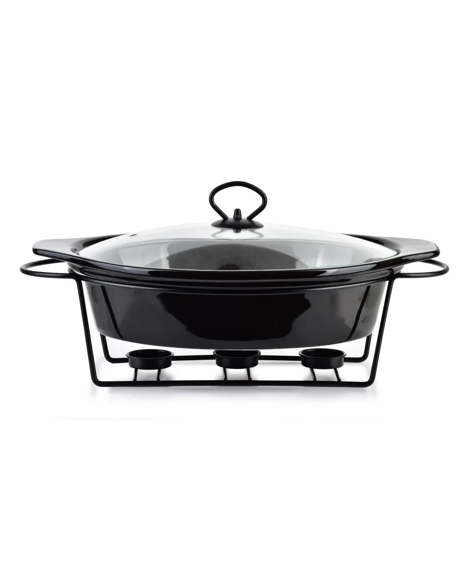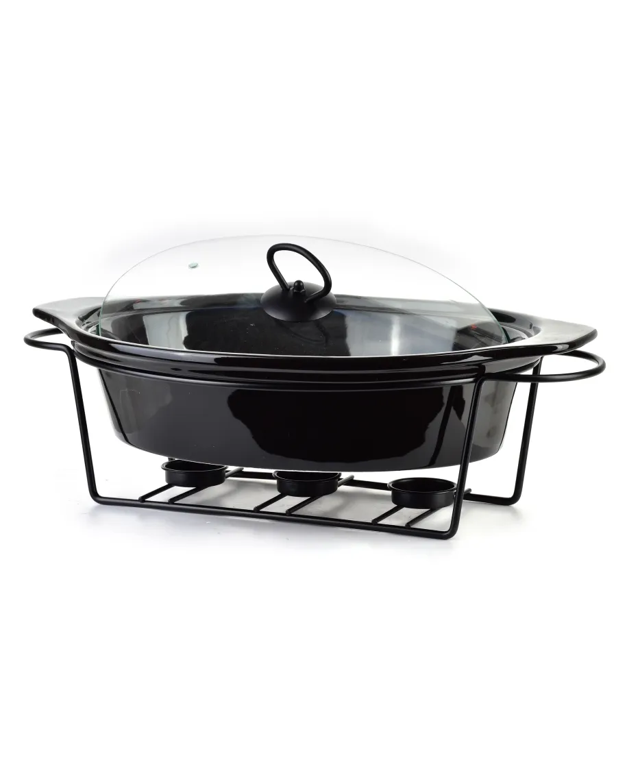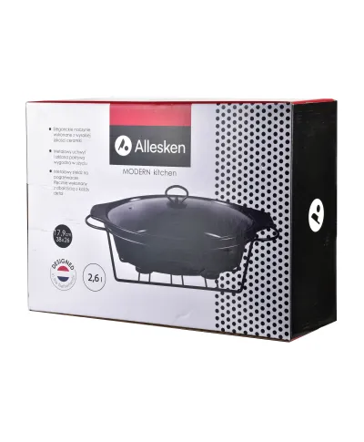Owalne naczynie z podgrzewaczem marki Allesken by MONDEX z serii MODERN KITCHEN to idealne rozwiązanie do serwowania ciepłych potraw, które utrzymają swoją temperaturę. Wbudowane w metalowym stelażu miejsce na świeczki typu tea-light sprawia, że potrawy zostają ciepłe przez długi czas, co czyni ten produkt niezastąpionym podczas spotkań i przyjęć. Zestaw 3 elementów: naczynia ceramicznego, metalowego stelaża i szklanej pokrywy wykonany z wysokiej jakości materiałów. Naczynie zachwyca nowoczesnym designem, który świetnie wpasuje się w każdą jadalnię, dodając jej elegancji.Trwałe materiały, z których wykonano naczynie, gwarantują długotrwałe użytkowanie. Allesken by MONDEX łączy w sobie elegancję i funkcjonalność, oferując produkt, który pozwoli cieszyć się gorącymi potrawami przez cały czas trwania posiłku.Zestaw posiada eleganckie opakowanie, co sprawia że naczynie jest doskonałym upominkiem.Naczynia nie zaleca się myć w zmywarce, szklaną pokrywę myć ręcznie, stojak czyścić wilgotną ściereczką.Można używać w piekarniku w temperaturze do 140C.Nie można używać w mikrofali.Nie można myć w zmywarce.Nie pozostawiać pustego naczynia nad zapalonymi świecami.Podgrzewać maksymalnie do 140C.Naczynie na 3 świeczki typu tea-light. Opakowanie nie zawiera świeczek w zestawie. Wymiary naczynia ceramicznego:Długość: 38cm Szerokość: 26cm Wysokość: 7,9cm Pojemność: 2,6l