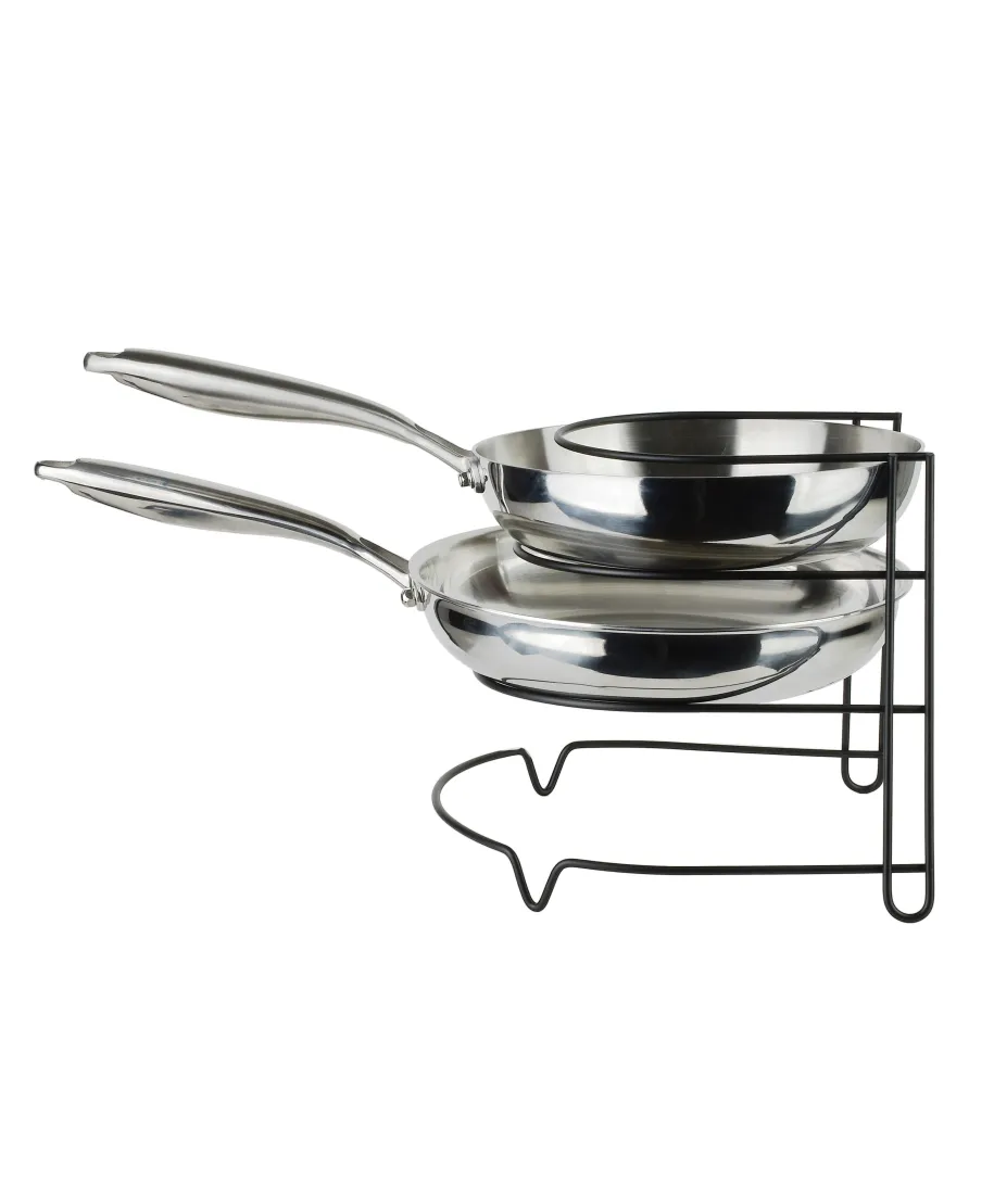 Stojak na patelnie MODERN KITCHEN to praktyczny i solidny organizer, który ułatwia przechowywanie patelni w sposób uporządkowany i oszczędzający miejsce. Wykonany z trwałego metalu w eleganckim, czarnym kolorze, wpisuje się w nowoczesne i industrialne aranżacje kuchenne. Jego kompaktowe wymiary 24,5 27 23 cm pozwalają na wygodne ustawienie zarówno w szafce, jak i na blacie kuchennym. Konstrukcja stojaka umożliwia przechowywanie trzech patelni o różnych rozmiarach, zabezpieczając je przed porysowaniem i ułatwiając szybki dostęp do każdej z nich. To funkcjonalne rozwiązanie, które sprzyja lepszej organizacji przestrzeni kuchennej i podnosi komfort codziennego gotowania.