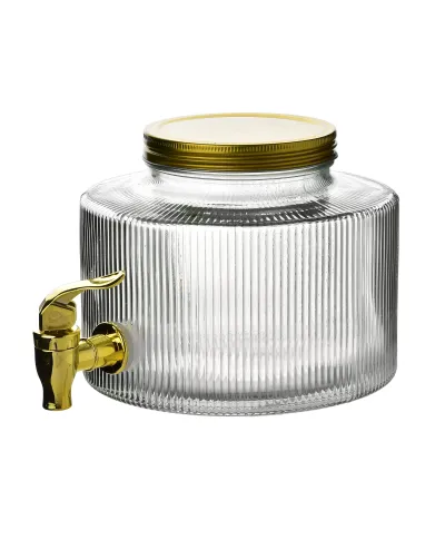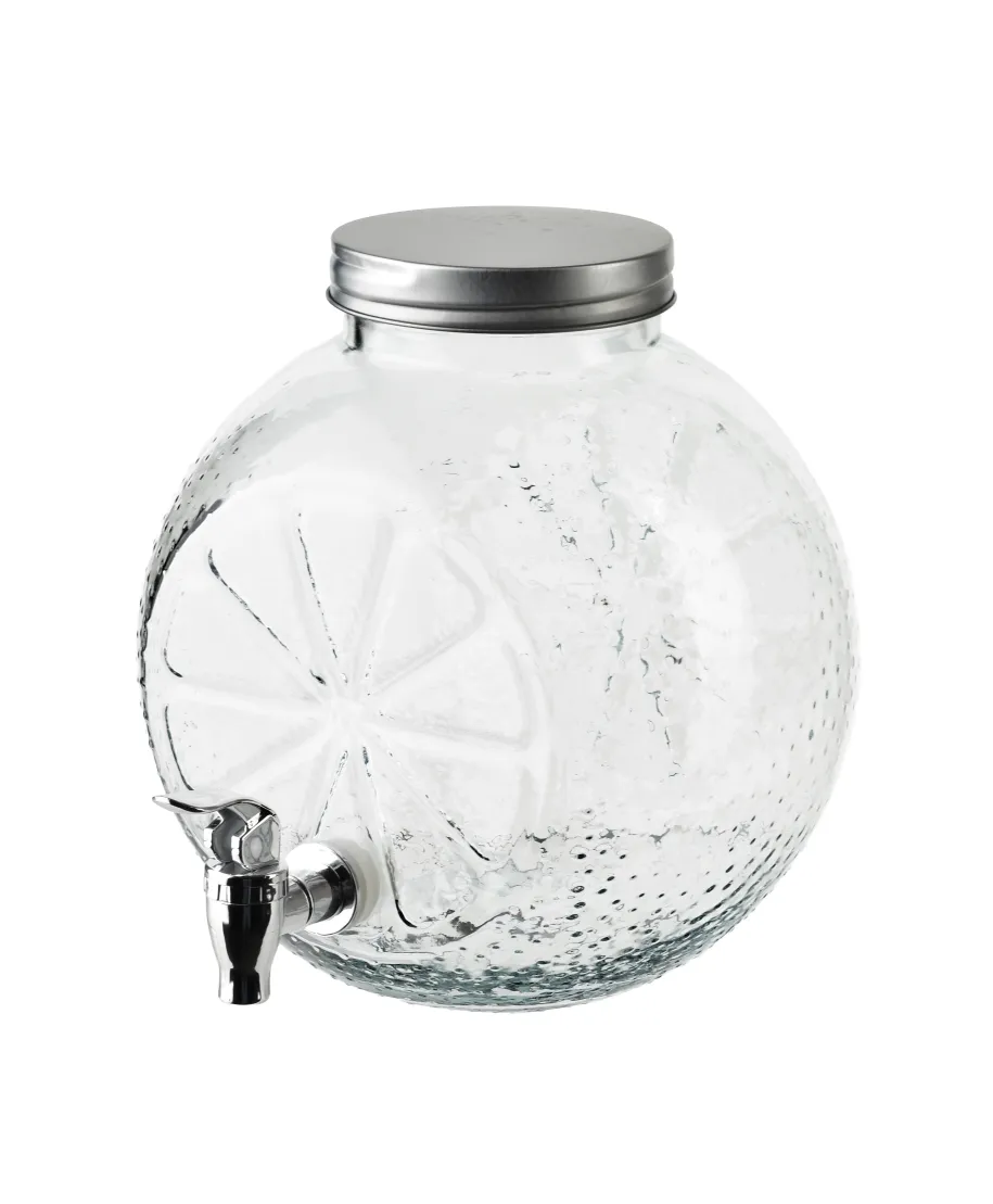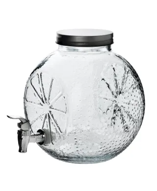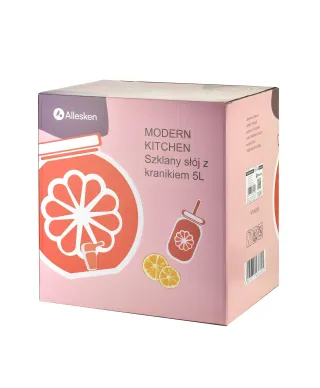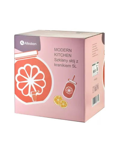 MODERN KITCHEN Szklany słój z kranikiem 5L . cytrusowa świeżość w eleganckim wydaniuPostaw na orzeźwiający styl i wygodę serwowania napojów dzięki szklanemu słojowi MODERN KITCHEN o pojemności 5 litrów, zdobionemu subtelnym motywem cytryny. Wykonany z przezroczystego szkła, z eleganckim kranikiem i praktycznym opakowaniem w color boxie, łączy w sobie estetykę, trwałość i funkcjonalność.kluczowe korzyści:Dekoracyjny motyw cytrynyTłoczenia inspirowane cytrusami dodają świeżości i lekkości . idealny dodatek do letniego stołu lub domowego bufetu.Pojemność 5L . idealny na spotkaniaDoskonały wybór na imprezy rodzinne, grille i przyjęcia . pomieści dużą ilość lemoniady, kompotu, ice tea czy wody z owocami.Wbudowany kranikUmożliwia wygodne i czyste nalewanie napojów bez konieczności podnoszenia słoja . idealne dla dzieci i dorosłych.Przezroczyste szkłoPozwala podziwiać kolory napojów, łatwe do utrzymania w czystości, neutralne dla smaku i zapachu.Estetyczne i praktyczne opakowanie . color boxŚwietny wybór na prezent . gotowy do wręczenia lub sprzedaży detalicznej w eleganckim kartoniku.Sprawdzi się idealnie podczas:przyjęć ogrodowych, domowych spotkań, eventów plenerowych, a także jako praktyczny i stylowy element wyposażenia kuchni.Zaleca się myć ręcznie