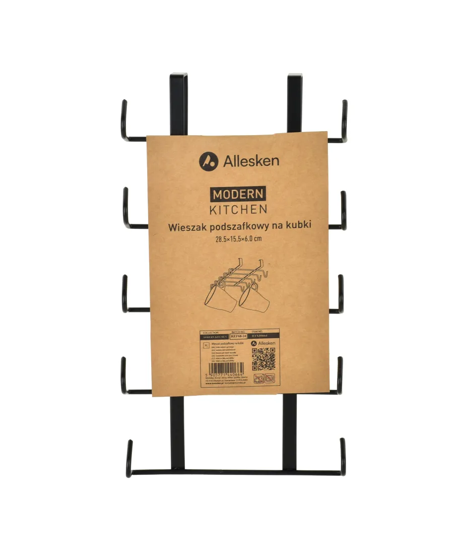 Wieszak podszafkowy na kubki MODERN KITCHEN to praktyczne i stylowe rozwiązanie do organizacji przestrzeni w kuchni. Wykonany z czarnego metalu, charakteryzuje się nowoczesnym wyglądem oraz solidną konstrukcją, która zapewnia stabilność i trwałość użytkowania. Dzięki wymiarom 28,5 15,5 6 cm doskonale mieści się pod szafką, oferując miejsce na zawieszenie aż 10 kubków. Taki sposób przechowywania nie tylko pozwala zaoszczędzić miejsce w szafkach, ale również wprowadza porządek i ułatwia dostęp do codziennie używanych naczyń. Matowe, czarne wykończenie wpisuje się w nowoczesne i industrialne aranżacje kuchenne, stanowiąc zarazem funkcjonalny i dekoracyjny element wyposażenia. Zawiera z zestawie śrubę do stabilnego przykręcenia.