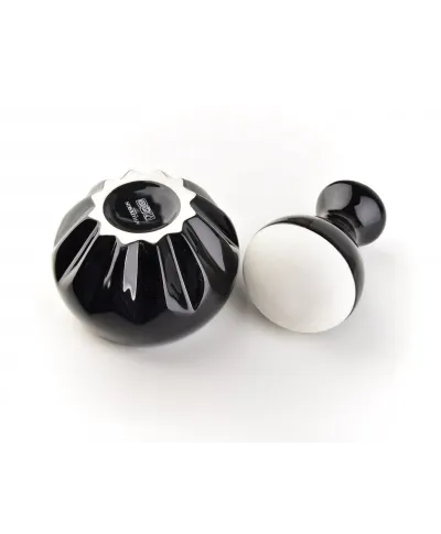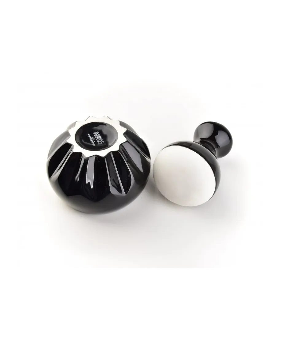 Moździerz wykonany z porcelany w kolorze czerni oraz bieli.