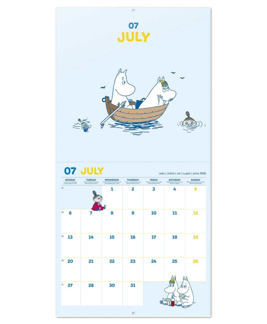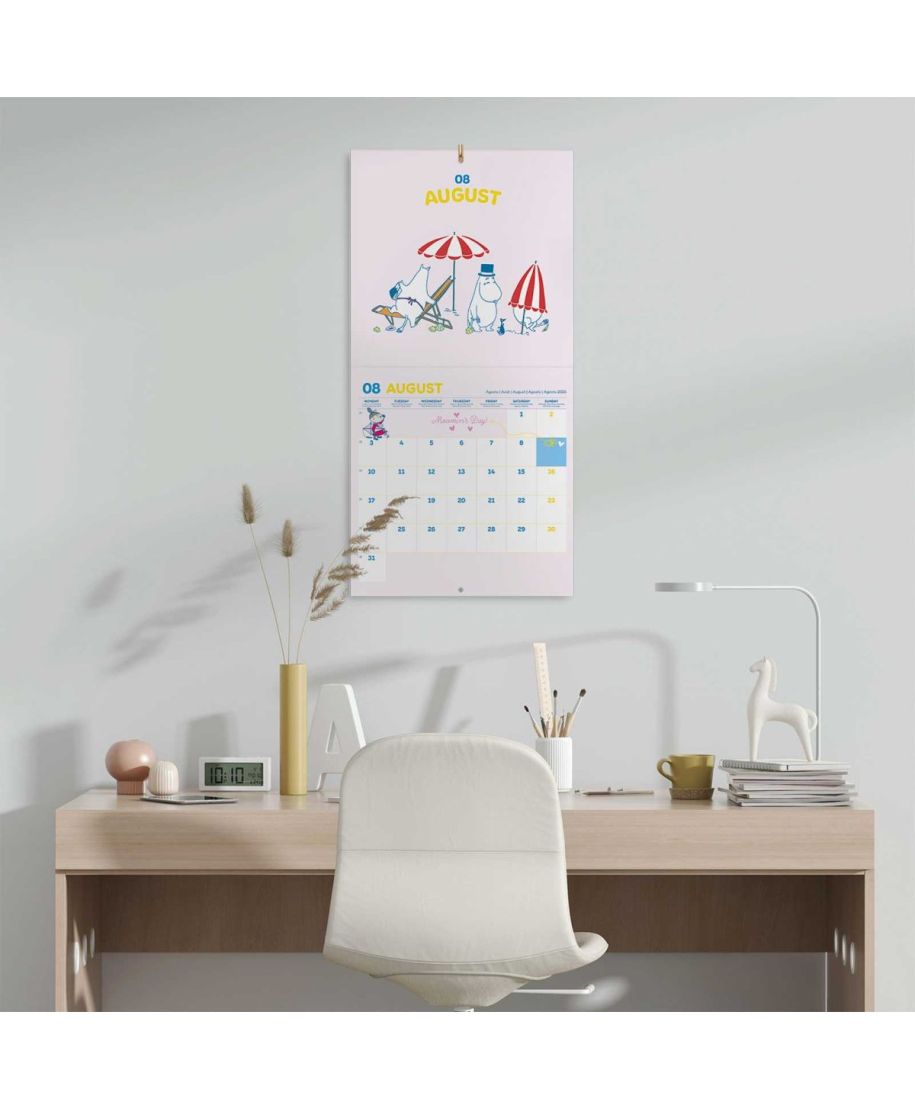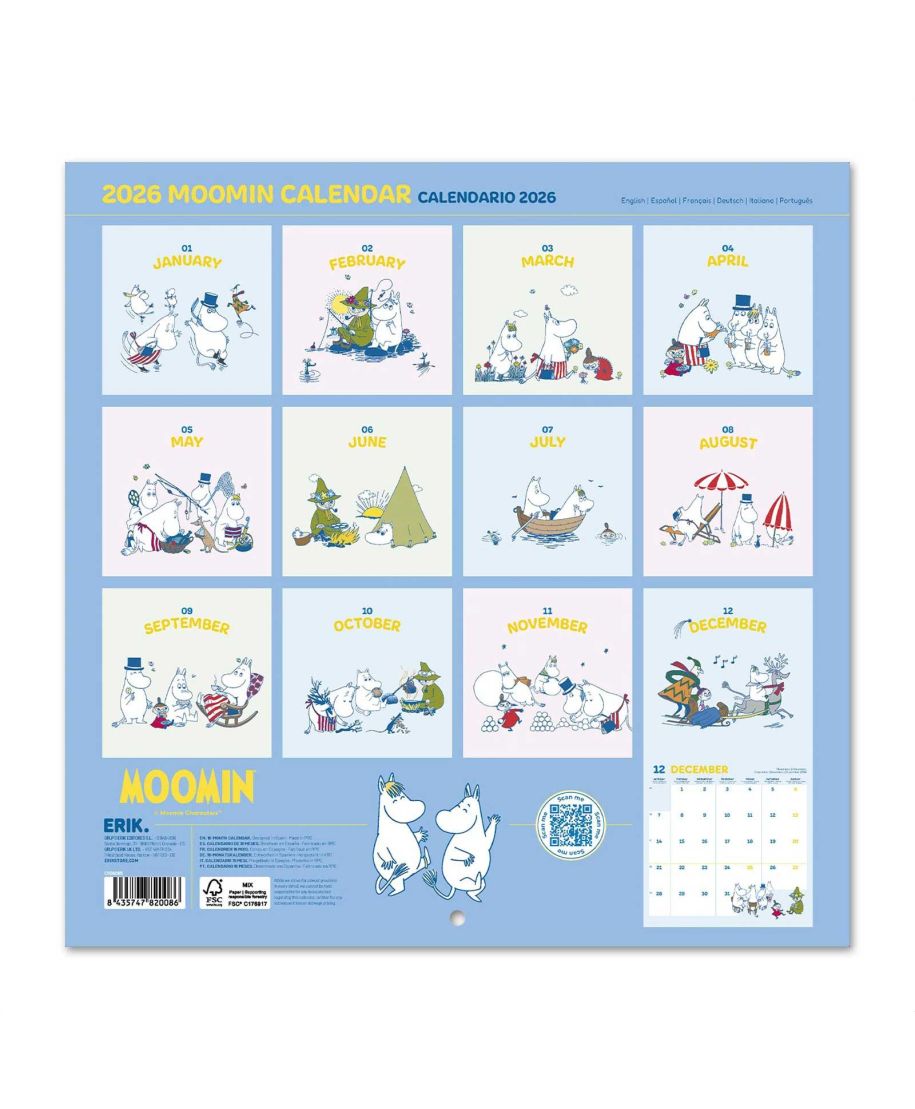 Muminki oficjalny kalendarz na ścianę na 2026rok Oryginalny i licencjonowany kalendarz, posiada 12 rozkładanych stron o wymiarach 30x60 cm. Na każdej z kart znajduje się duża fotografiaoraz czytelne kalendarium z miejscem na notatki. W kalendarzu znajduje się 12 unikalnych zdjęć dla każdego miesiąca + plakat. Okładki wykonane są z papieru powlekanego matowego i laminowanego o gramaturze 250 g/m2, wnętrze z papieru powlekanego matowego o gramaturze 150 g/m2. Nagłówki są w 6 językach:angielski, hiszpański, francuski, włoski, niemiecki i portugalski. Oprawa zszywkowa. Złożony kalendarz 30x30 cm. Rozłożony kalendarz 30x60 cm. Zawiera otwór 5 mm do zawieszenia na ścianie.