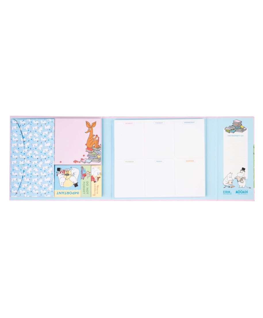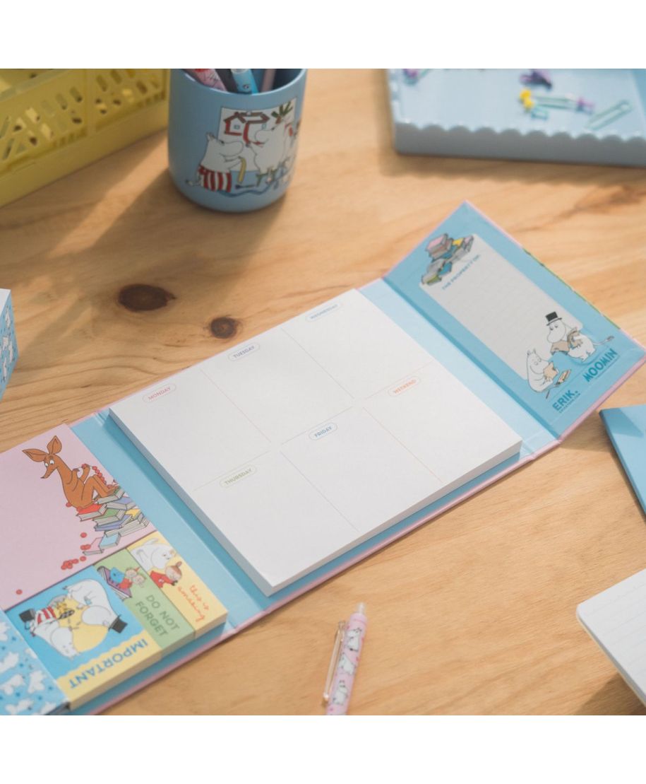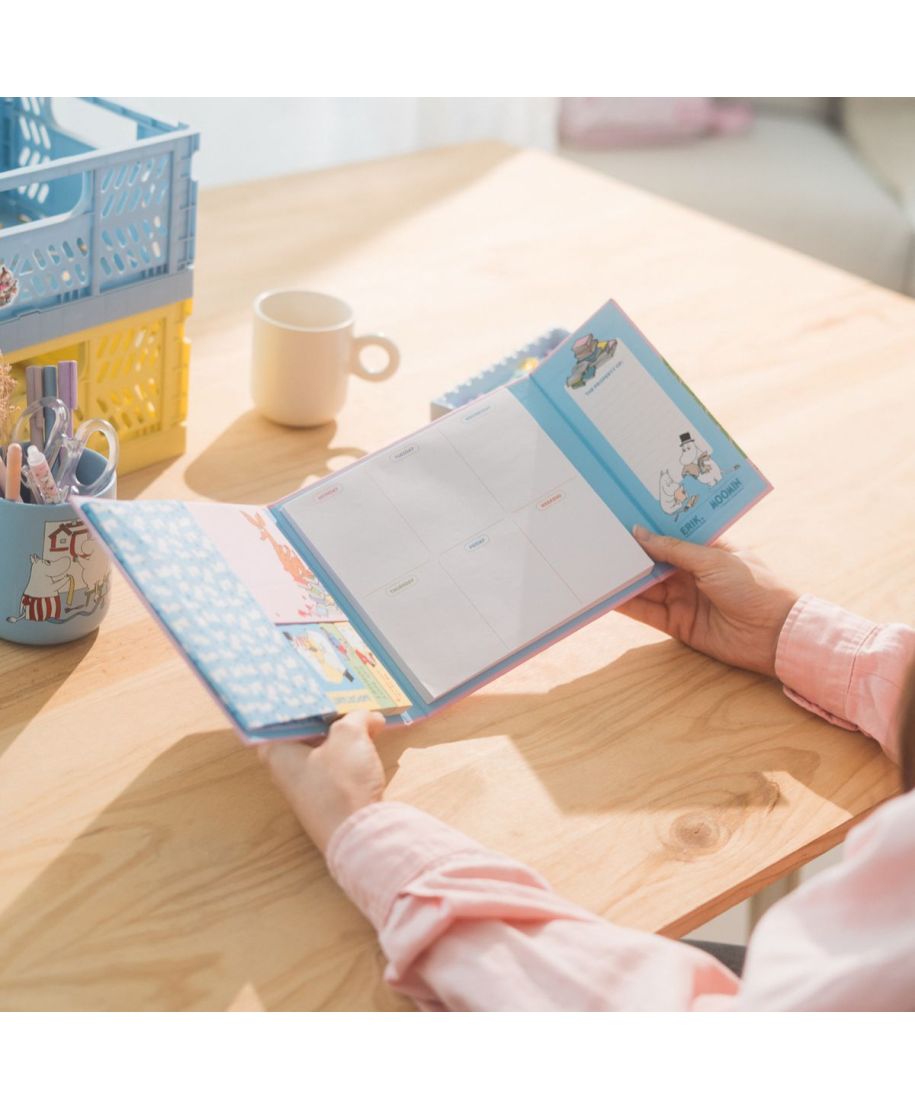 Muminki - planer tygodniowy z notesami i listami Numer katalogowy: PSNA010 Producent: Grupo Erik Wymiary: 19,3 × 16,5 × 2 cm Planer tygodniowy z dodatkowymi notesami i listami z motywem Muminków. Okładka twarda, grafika od frontu, tył pokryty barwnym wzorem. Notatniki o różnych rozmiarach oraz listy ułatwiają organizację zadań i obowiązków, kompatybilność z pisaniem markerami lub długopisami. Format zamknięty wygodny do przenoszenia, rozłożony daje przestrzeń do rozplanowania tygodnia. Szczegóły techniczne Forma: planer tygodniowy + notatniki Liczba notatników/list: kilka różnych rozmiarów Okładka: twarda Motyw: Muminki Oryginalny produkt na oficjalnej licencji Muminki / Grupo Erik.