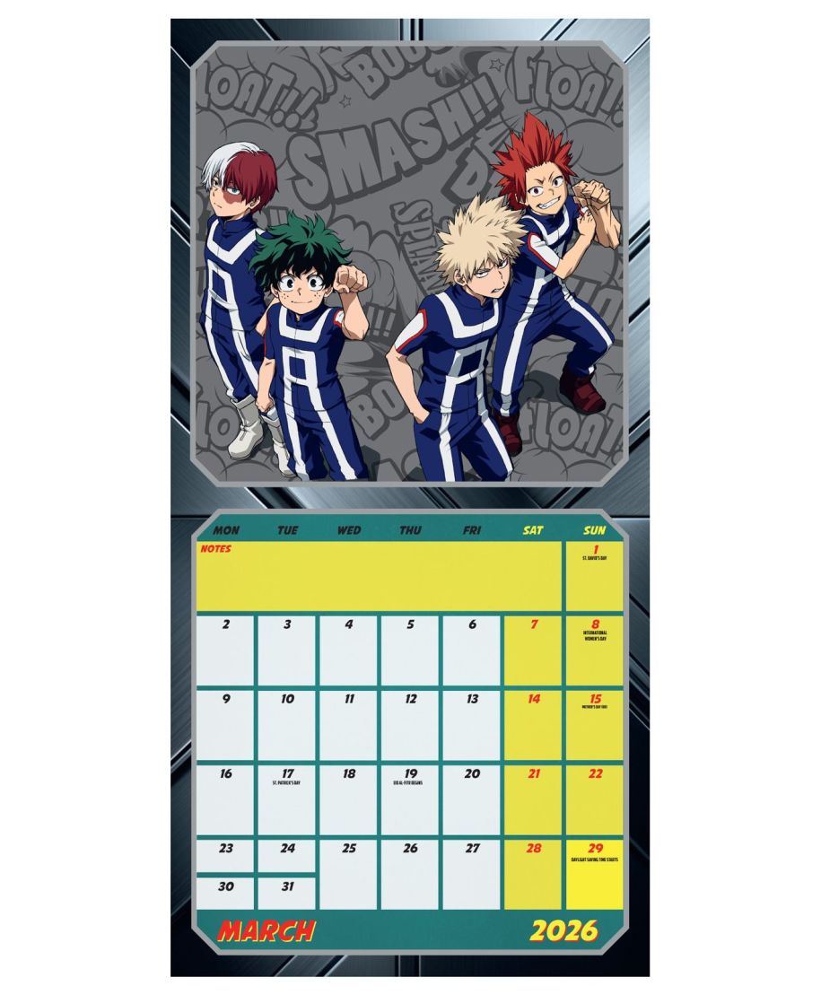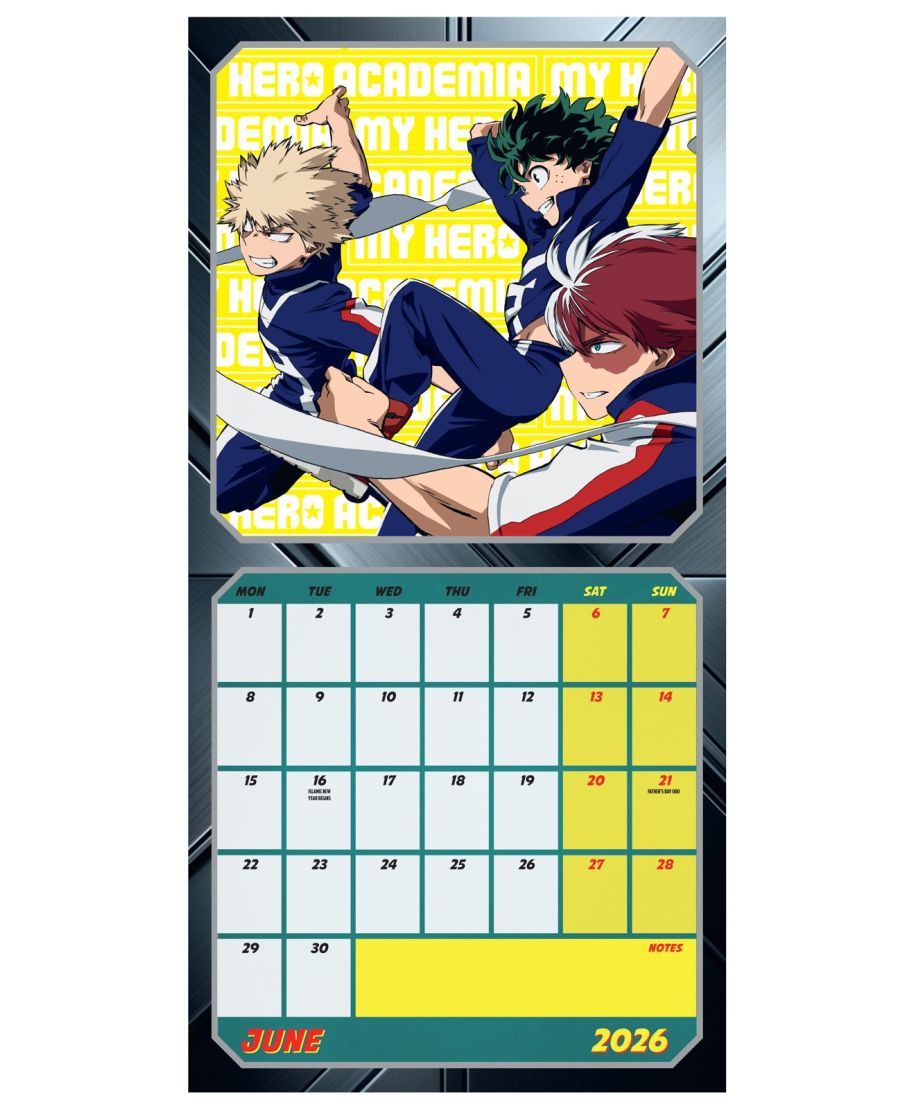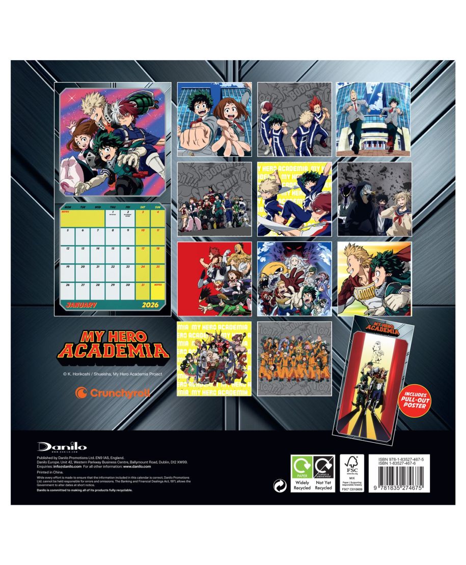 My Hero Academia oficjalny kalendarz na ścianę na 2026rok Oryginalny i licencjonowany kalendarz, posiada 12 rozkładanych stron o wymiarach 30x60 cm. Na każdej z kart znajduje się duża fotografiaoraz czytelne kalendarium z miejscem na notatki. W kalendarzu znajduje się 12 unikalnych zdjęć dla każdego miesiąca + plakat. Okładki wykonane są z papieru powlekanego matowego i laminowanego o gramaturze 250 g/m?, wnętrze z papieru powlekanego matowego o gramaturze 150 g/m?. Nagłówki są w języku angielskim. Oprawa zszywkowa. Złożony kalendarz 30x30 cm. Rozłożony kalendarz 30x60 cm. Zawiera otwór 5 mm do zawieszenia na ścianie.