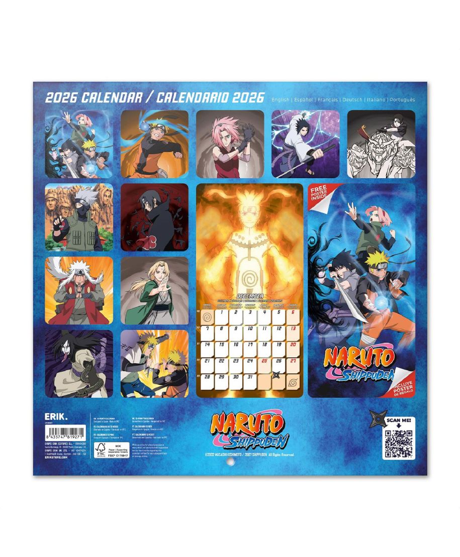 Naruto Shippuden oficjalny kalendarz na ścianę na 2026rok Oryginalny i licencjonowany kalendarz, posiada 12 rozkładanych stron o wymiarach 30x60 cm. Na każdej z kart znajduje się duża fotografiaoraz czytelne kalendarium z miejscem na notatki. W kalendarzu znajduje się 12 unikalnych zdjęć dla każdego miesiąca + plakat. Okładki wykonane są z papieru powlekanego matowego i laminowanego o gramaturze 250 g/m2, wnętrze z papieru powlekanego matowego o gramaturze 150 g/m2. Nagłówki są w 6 językach:angielski, hiszpański, francuski, włoski, niemiecki i portugalski. Oprawa zszywkowa. Złożony kalendarz 30x30 cm. Rozłożony kalendarz 30x60 cm. Zawiera otwór 5 mm do zawieszenia na ścianie.