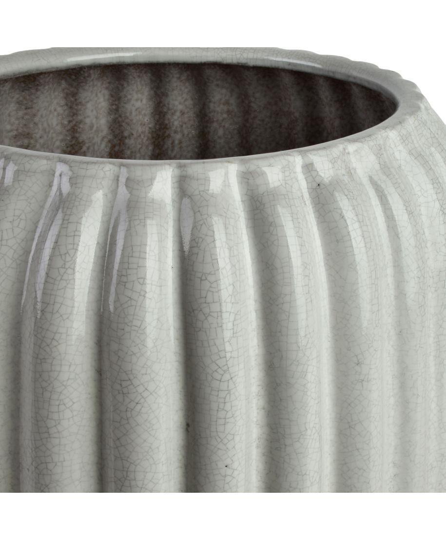 Komplet dwóch osłonek ceramicznych NEVA marki MONDEX to propozycja o unikalnym wykończeniu, które wprowadza do wnętrza artystyczny i wyrafinowany charakter. Powierzchnia naczyń wyróżnia się jasną kolorystyką oraz specjalnym efektem dekoracyjnym w postaci faktury spękanego szkliwa, co nadaje im subtelnej głębi i sprawia, że każda sztuka jest niepowtarzalna. Dodatkowo korpus osłonek zdobią regularne, pionowe tłoczenia, które podkreślają ich nowoczesną, cylindryczną formę i nadają całości strukturalnej lekkości.Zestaw obejmuje dwa naczynia o pokaźnych wymiarach: większe o parametrach 40x40x44 cm oraz mniejsze o wymiarach 28x28x40,5 cm, co pozwala na efektowną ekspozycję dużych roślin doniczkowych. Pękata, harmonijna forma osłonek zwężająca się u góry sprawia, że doskonale prezentują się one bezpośrednio na podłodze w salonach, biurach czy przestronnych korytarzach. Wykonane z wysokiej jakości ceramiki naczynia nie są mrozoodporne, dlatego są dedykowane wyłącznie do aranżacji wewnątrz pomieszczeń, gdzie ich staranne wykończenie stanie się eleganckim dopełnieniem stylu nowoczesnego lub skandynawskiego.