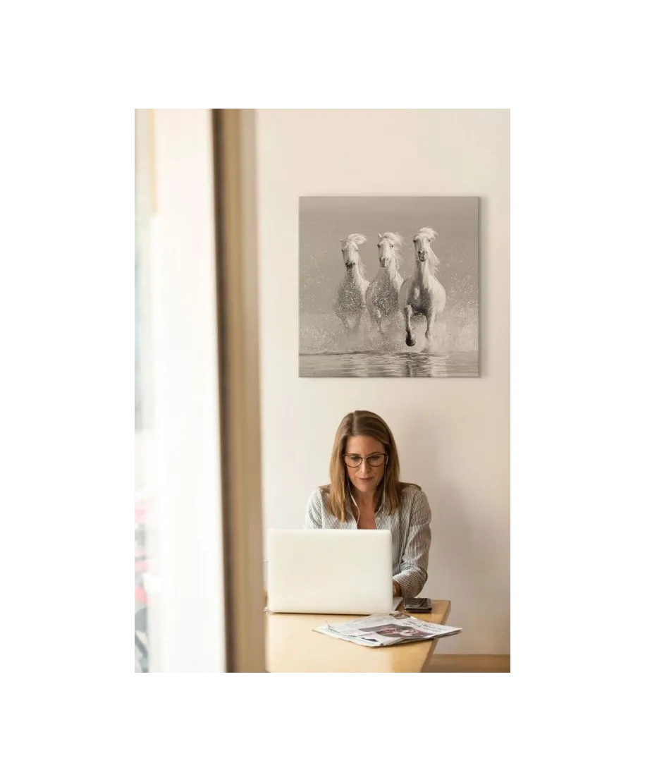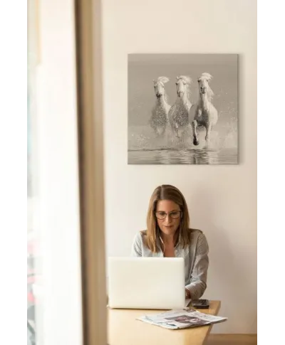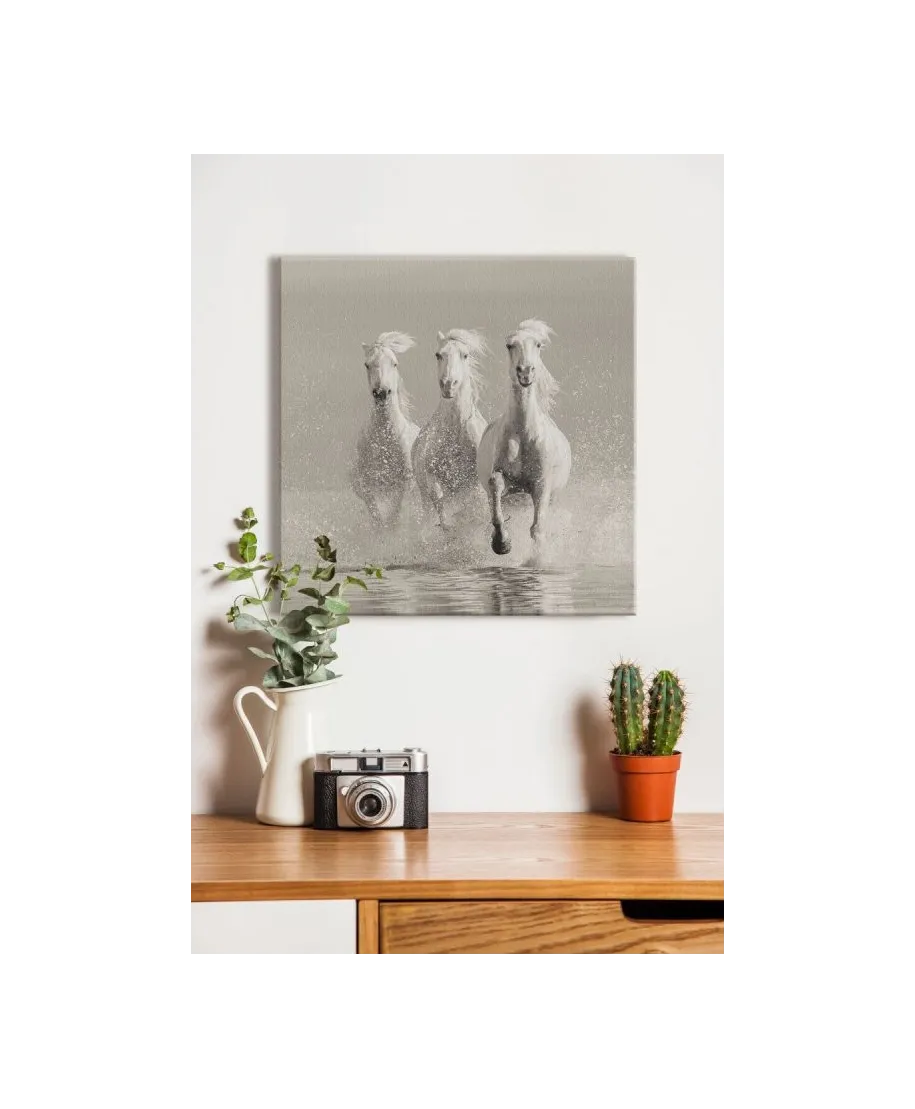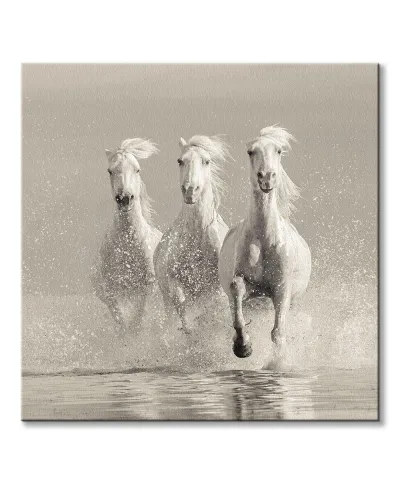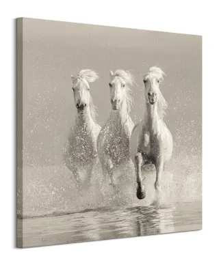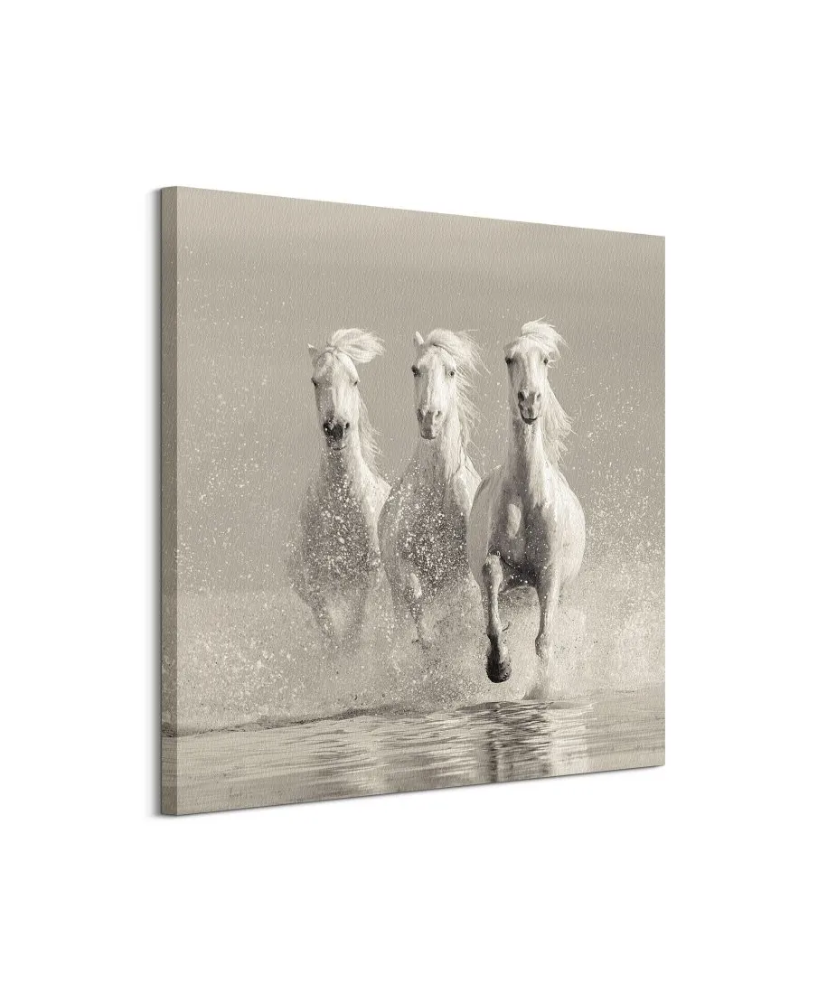 Three White Horses - obraz na płótnie Naciągnięty na sosnowe krosna. Gotowy do zawieszenia na ścianę. Wykonany z najwyższą dbałością o detale. Obraz jest ostry a barwy nasycone. Ten egzemplarz posiada zadrukowane boki, nie trzeba go dodatkowo oprawiać. Płótno bawełniane na który został naniesiony obraz jest bardzo mocne i posiada ciekawą fakturę. Blejtrama wykonana jest natomiast z grubego drzewa sosnowego. Jest solidna, jej szerokość to 3,5 cm a grubość 2 cm. Kupując ten produkt masz pewność, że kupujesz z legalnego źródła i wspierasz artystów. Obraz jest oryginalny i posiada licencję. Lubisz wyróżniać się ciekawymi, ekskluzywnymi dekoracjami na ścianę? Ten obraz jest idealny dla Ciebie. Nikt nie przejdzie obojętnie obok niego, jest po prostu piękny. Dane techniczne: Płótno bawełniane 300g/m2. Sosnowe krosna o grubości 2 cm i szerokości 3,5 cm. Obraz zadrukowany cyfrowo. Wymiary obrazu 85x85 cm. Marka: Pyramid Posters.
