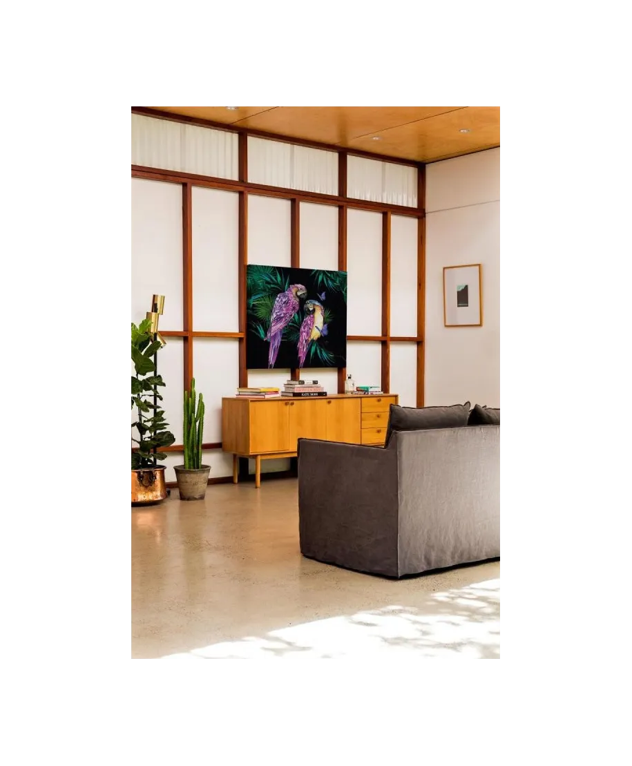 Parrots - obraz na płótnie Naciągnięty na sosnowe krosna. Gotowy do zawieszenia na ścianę. Wykonany z najwyższą dbałością o detale. Obraz jest ostry a barwy nasycone. Ten egzemplarz posiada zadrukowane boki, nie trzeba go dodatkowo oprawiać. Płótno bawełniane na który został naniesiony obraz jest bardzo mocne i posiada ciekawą fakturę. Blejtrama wykonana jest natomiast z grubego drzewa sosnowego. Jest solidna, jej szerokość to 3,5 cm a grubość 2 cm. Kupując ten produkt masz pewność, że kupujesz z legalnego źródła i wspierasz artystów. Obraz jest oryginalny i posiada licencję. Lubisz wyróżniać się ciekawymi, ekskluzywnymi dekoracjami na ścianę? Ten obraz jest idealny dla Ciebie. Nikt nie przejdzie obojętnie obok niego, jest po prostu piękny. Dane techniczne Płótno bawełniane 300g/m2 Sosnowe krosna o grubości 2 cm i szerokości 3,5 cm Obraz zadrukowany cyfrowo Wymiary obrazu 60x60 cm